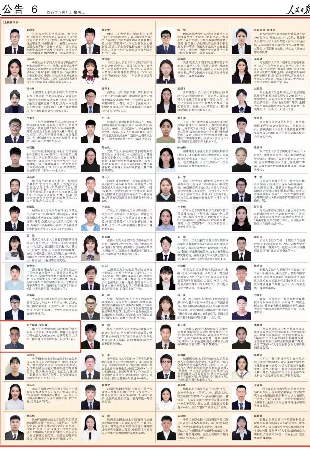 近日,《人民日报》专版刊登《2020—2021学年度本专科生国家奖学金获奖学生代表名录》《2020—2021学年度中等职业教育国家奖学金获奖学生代表名录》,分别展示本专科生、中等职业教育国家奖学金获奖学生中的100名优秀代表的风采。