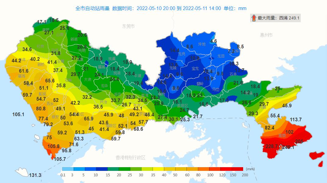 11日我市出现暴雨局部特大暴雨,暴雨及以上降水主要出现在大鹏、南山、福田、宝安和罗湖。