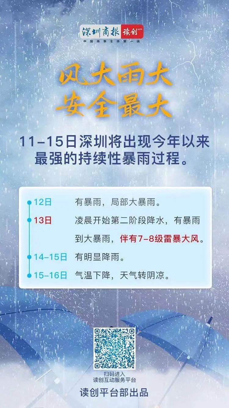 12日凌晨起降雨再度加强,有暴雨到大暴雨局部特大暴雨,强降雨较大可能出现在宝安南部、南山、福田、盐田、大鹏及深汕。