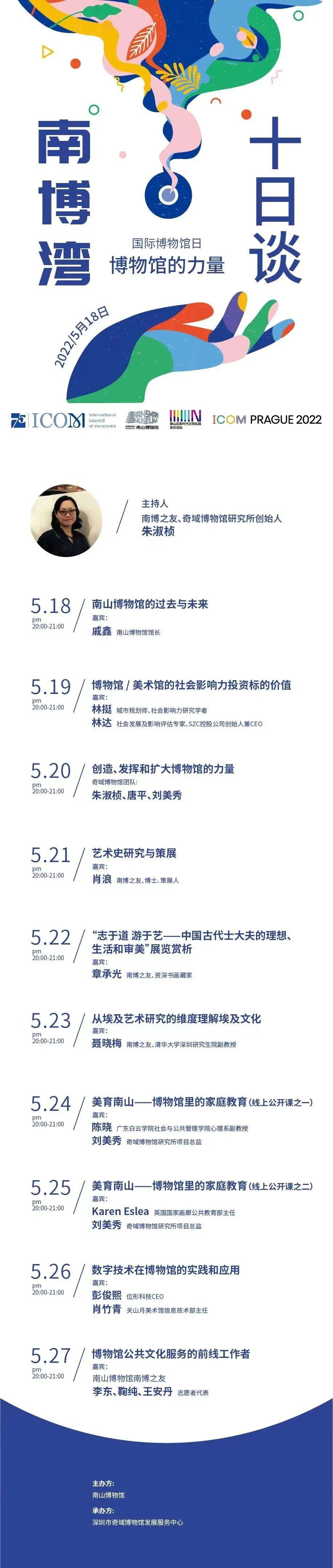 在5月18-27日期间,南山博物馆将邀请南博之友代表、博物馆人、文化人、艺术家、志愿者等嘉宾围绕国际博物馆协会“博物馆的力量”三个视角进行分享,一起探讨中国的“博物馆力量”如何发挥作用,促进社会与地区发展。