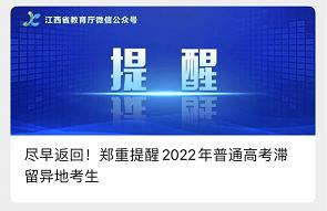 5月16日,江西省教育考试院发布郑重提醒,目前仍滞留在省外及省内非考试当地的考生,尽早返回考试当地并积极做好防疫护考。