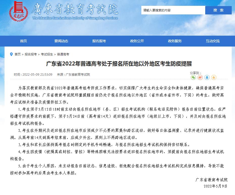 5月9日,广东省教育考试院发布广东省2022年普通高考处于报名所在地以外地区考生防疫提醒。
