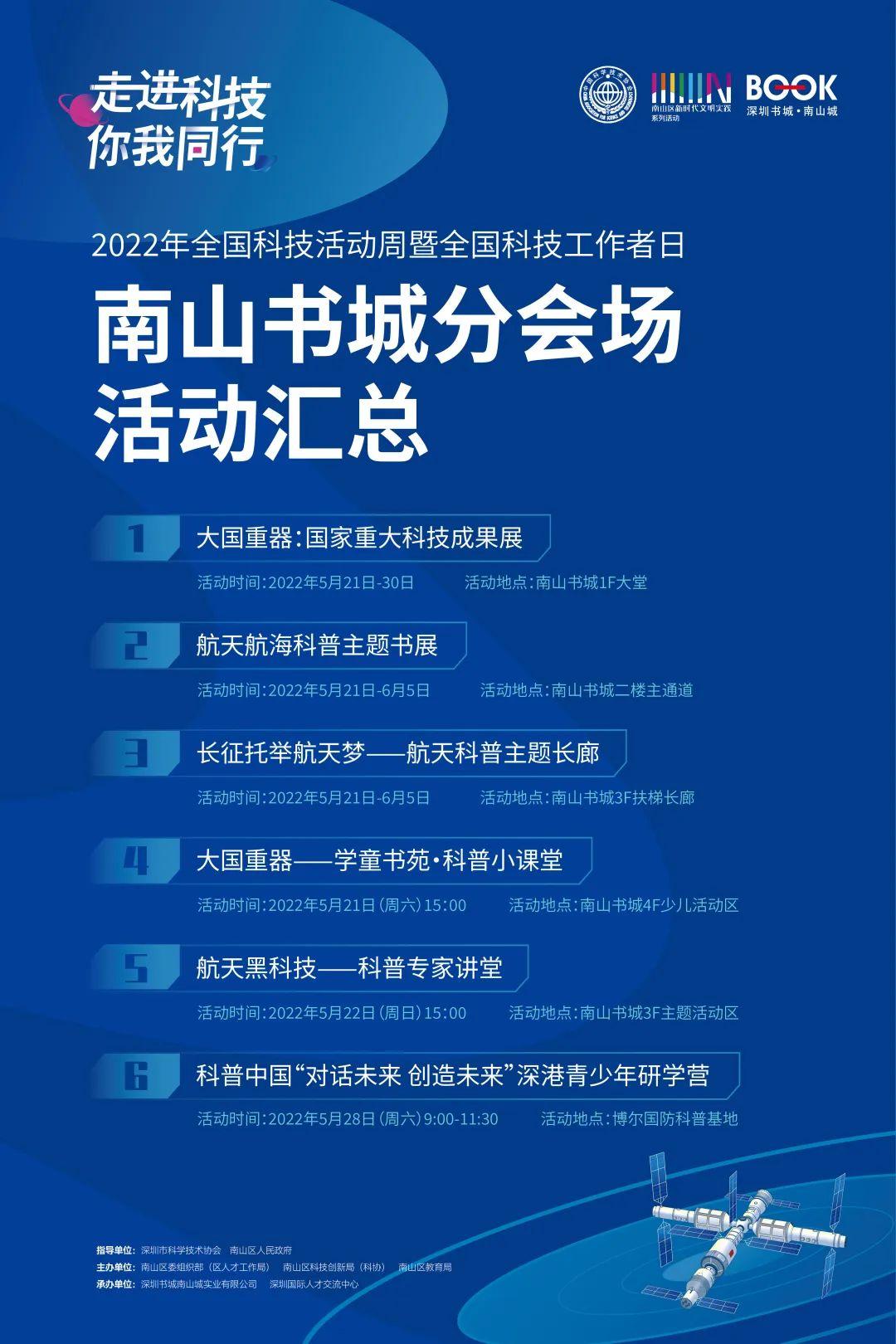 南山书城将在全国科技活动周期间,举办航天科普画廊、航天及海洋主题书展、模型展示、学童书苑·航天课堂、海洋科普讲堂、青少年研学营等科普系列活动。