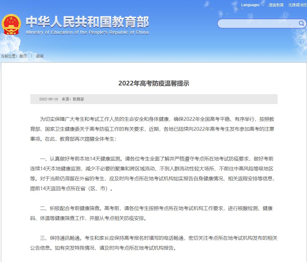 为切实保障广大考生和考试工作人员的生命安全和身体健康,确保2022年全国高考平稳、有序举行,近日,教育部发布2022年高考防疫温馨提示: