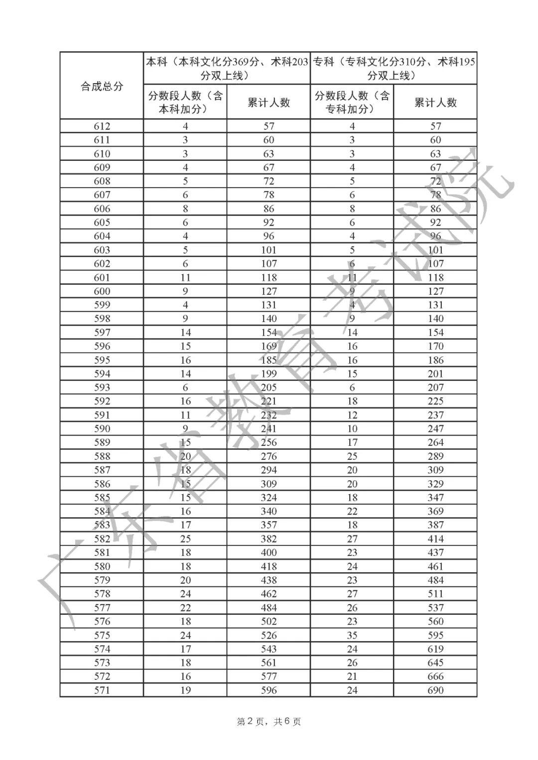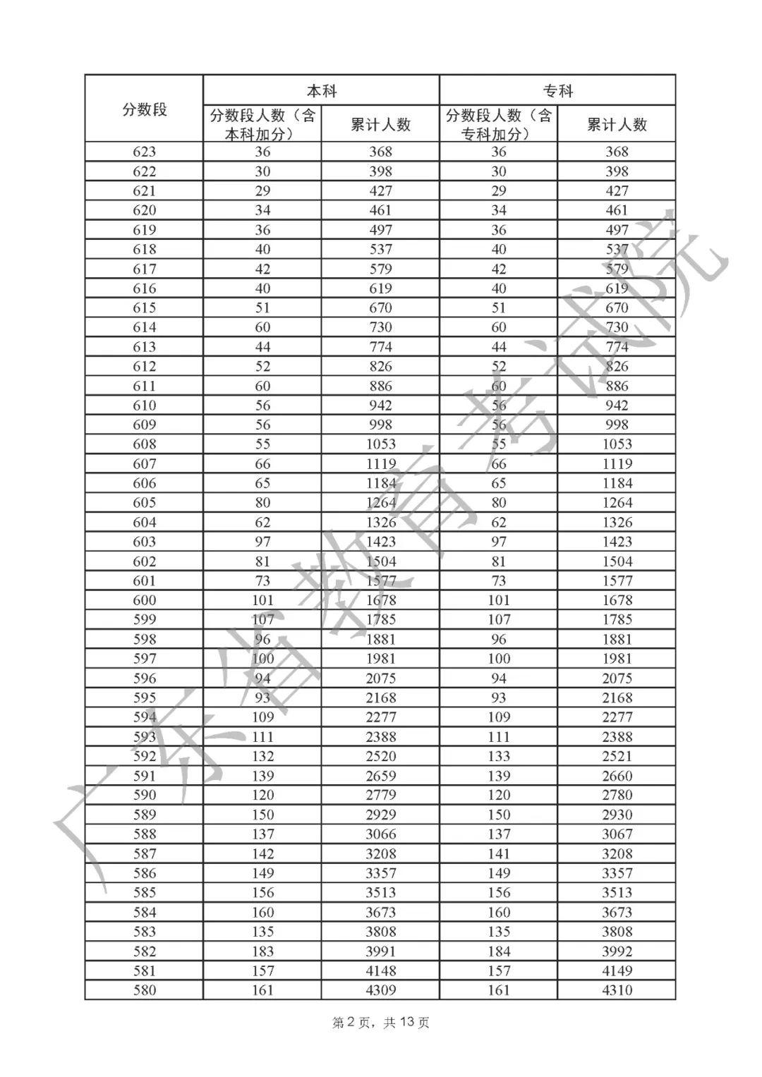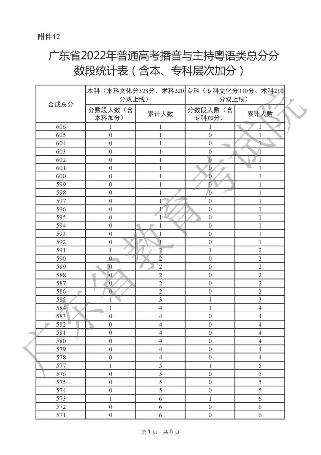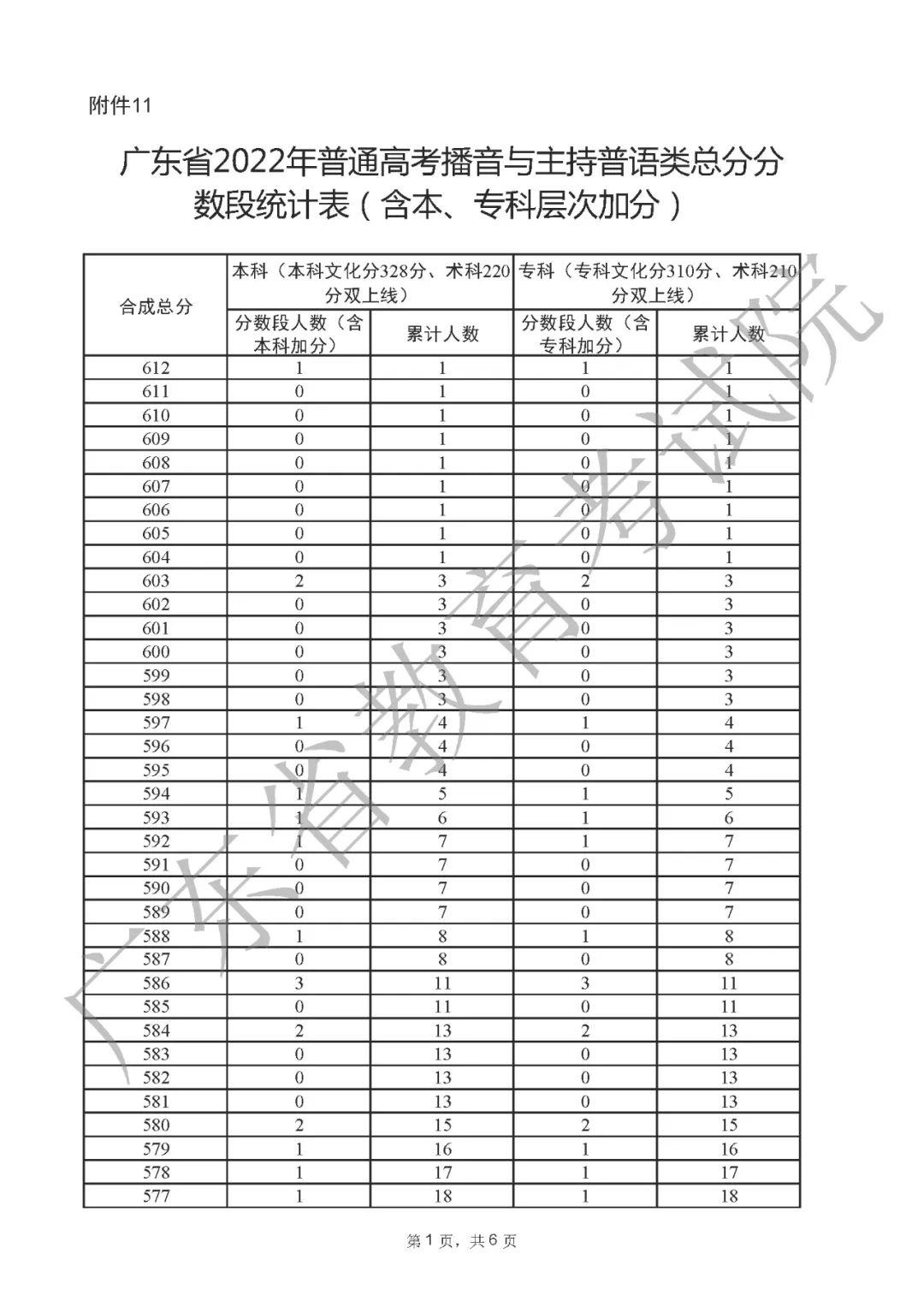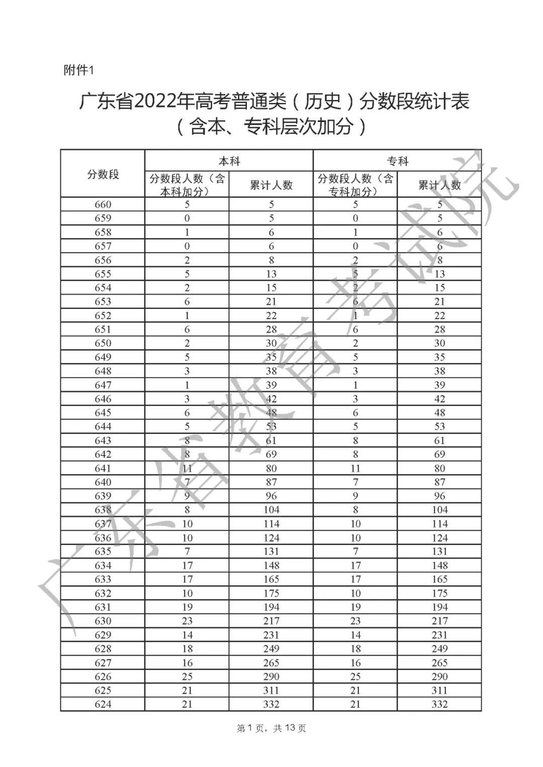 2022年广东高考“一分一段表”