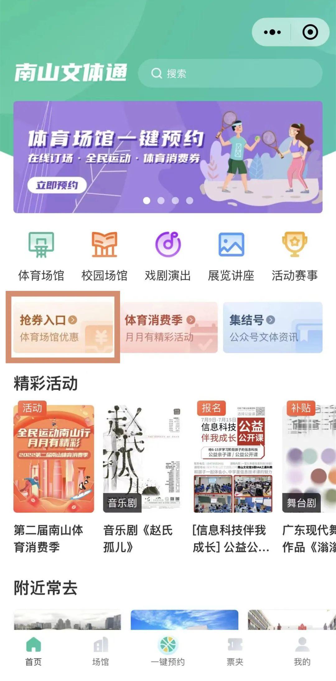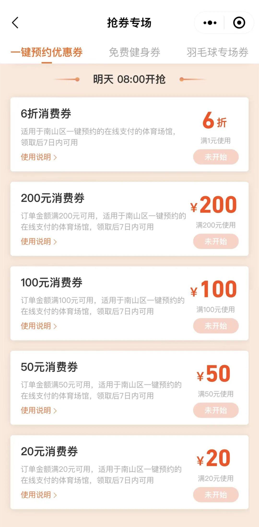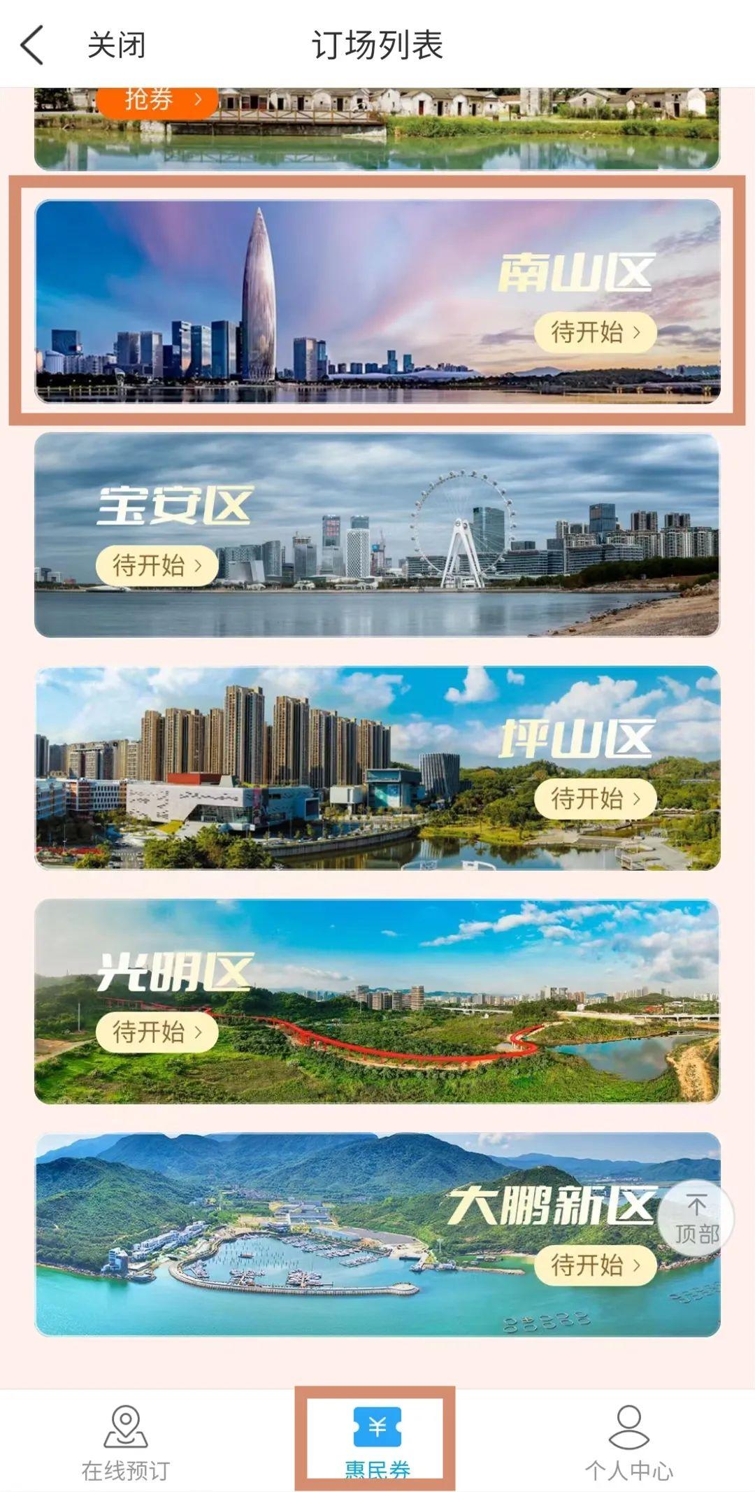 ①方式一:登录“i深圳”APP,点击首页【体育场馆预约】,选择底栏【惠民券】,找到【南山区】,即可参与抢券。
