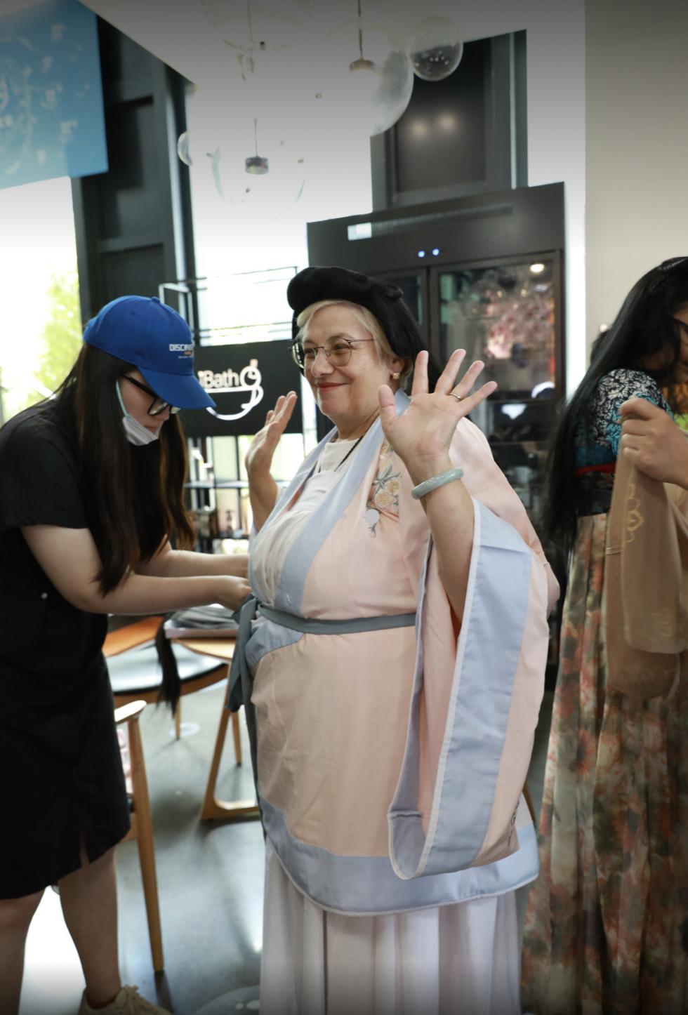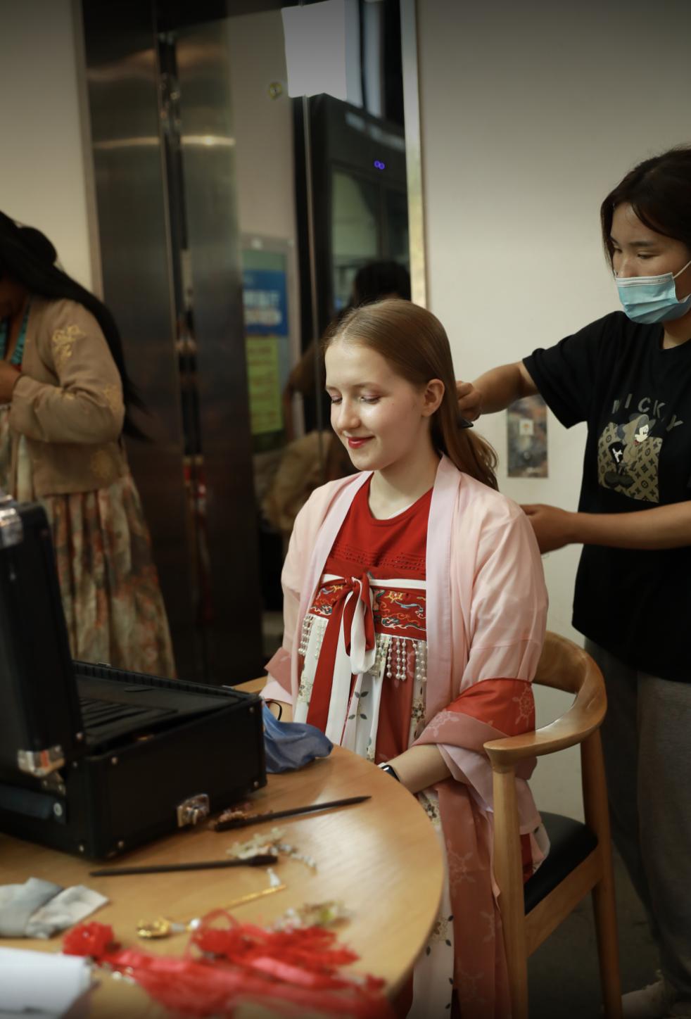 午间休憩时间,现场准备了多套汉服和头饰,让外籍友人自由选择自己喜欢的服饰,体验一把分分钟穿越到中国古代的浪漫,通过这些美丽的服饰和穿着的仪式感,也让他们对中国传统文化有更深一层的了解。