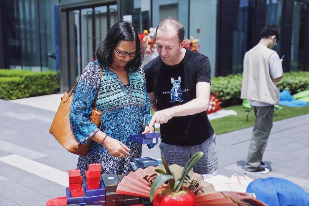 户外活动区围满了好奇的身影,在这里完成汉语考试答题,就能领取各种中国风的小礼物,外籍友人玩得不亦乐乎,笑声连连。