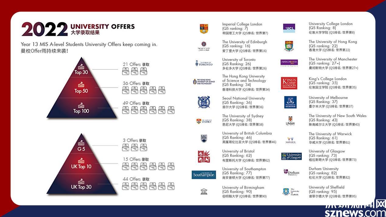 翻开曼校4年的办学历史,曼校学子们历年都在用自己的实力刷新着国际高考的新纪录。自2019年起,连续三届毕业生均获得世界一流大学的录取,其中不乏帝国理工学院、伦敦大学等G5大学;2022年曼校毕业生更是收到33封世界排名TOP30名校的录取。他们的成就,正是体现了曼校以培养具有健康体魄和健全人格的优秀世界公民为己任的办学理念。