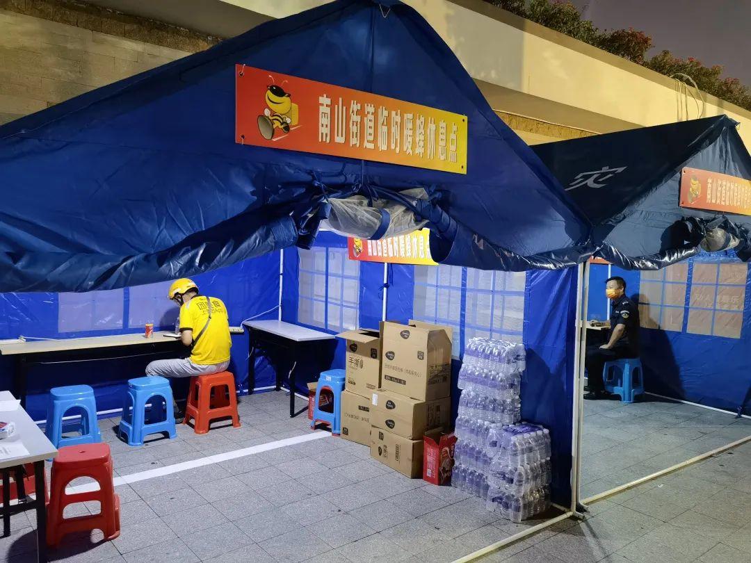 ▲南山街道临时暖蜂驿站为骑手免费提供临时休息、充电、饮水、防疫用品等便民服务。