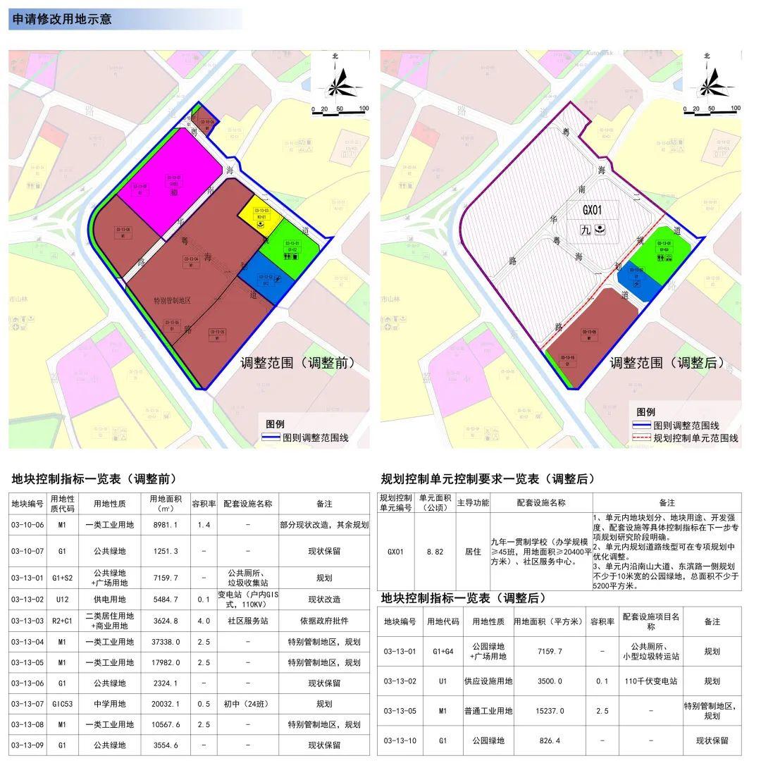 调整后,3块工业用地、3块公共绿地的部分用地及全部用地与居住用地、中学用地划为一个规划控制单元。单元面积为8.82万平方米,主导功能为居住,配套建设一所办学规模大于45班、用地面积大于2万平方米的九年一贯制学校,以及1个社区服务中心。