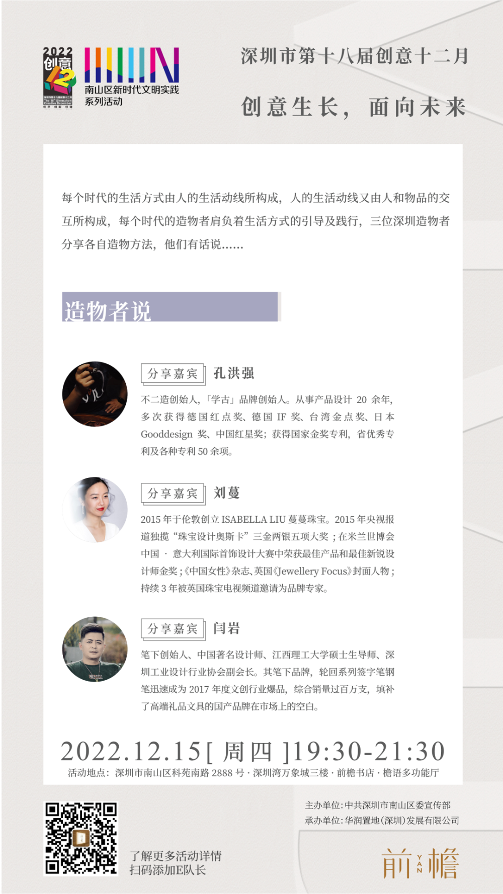 每个时代的生活方式由人的生活动线所构成,人的生活动线又由人和物品的交互所构成,每个时代的造物者肩负着生活方式的引导及践行。本次活动,三位深圳“造物者”将分享他们各自的造物方法。