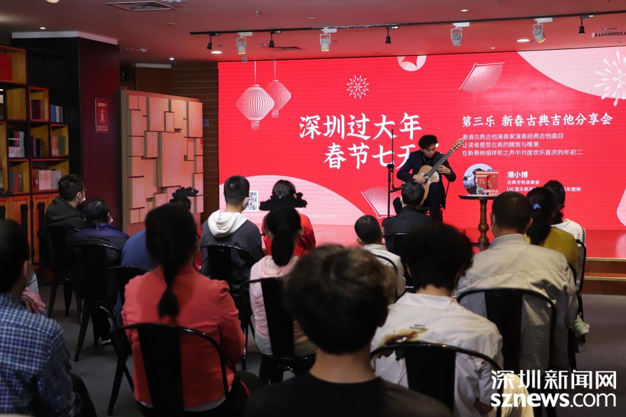 大年初二由新春古典吉他分享会奏响,当日下午,书城邀请了古典吉他演奏家濮小博,在书城三楼主题活动区为大家献上了一场精彩绝伦的吉他分享会。分享会以“演奏加解说”的形式展开,现场观众在濮老师专业有趣的讲解中感受曲子里和弦转换的美妙。在《西班牙随想曲》《华丽华尔兹》《舞会天使》等美妙的古典吉他乐曲中,大家似乎都随着音符穿越到了18、19世纪,体会到了那个时代的音乐魅力。