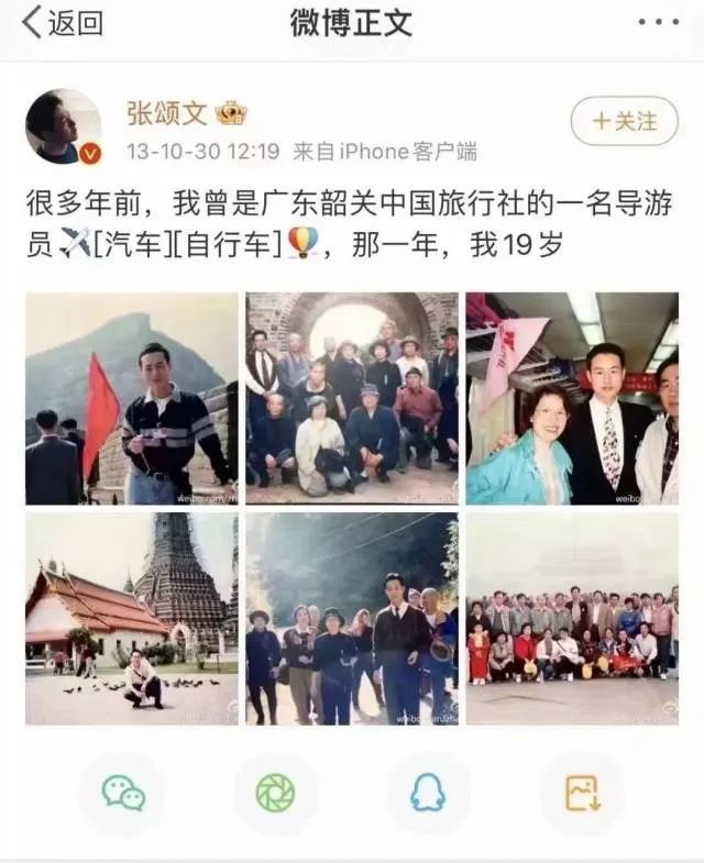 现在,网上还流传着张颂文举着红色导游旗,身着鸡心领毛衣和白衬衫、打着领带的照片,其中一张拍摄于万里长城。