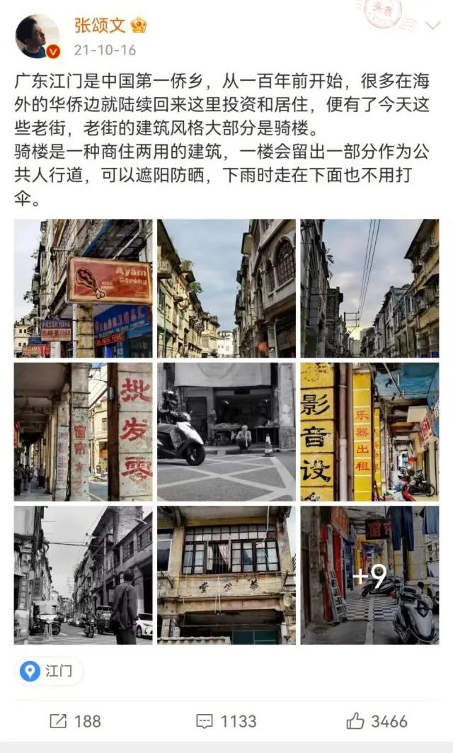 多年以后,张颂文非常感谢当导游这段经历。他说,导游工作让他接触到更多人群,积累了更多的生活阅历,也带给他人生更多的可能。正因为做过导游,现在的张颂文在微博上依旧保持着随时分享美食、美景的习惯。比如最近人气飙升的《狂飙》取景地江门,张颂文就曾在个人微博上推荐过。