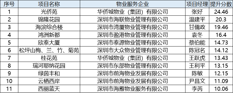 以下11个物业项目的在管物业服务企业能够及时整改,在全市的环卫指数测评中分数年度提升在10分以上,望再接再厉,继续保持。