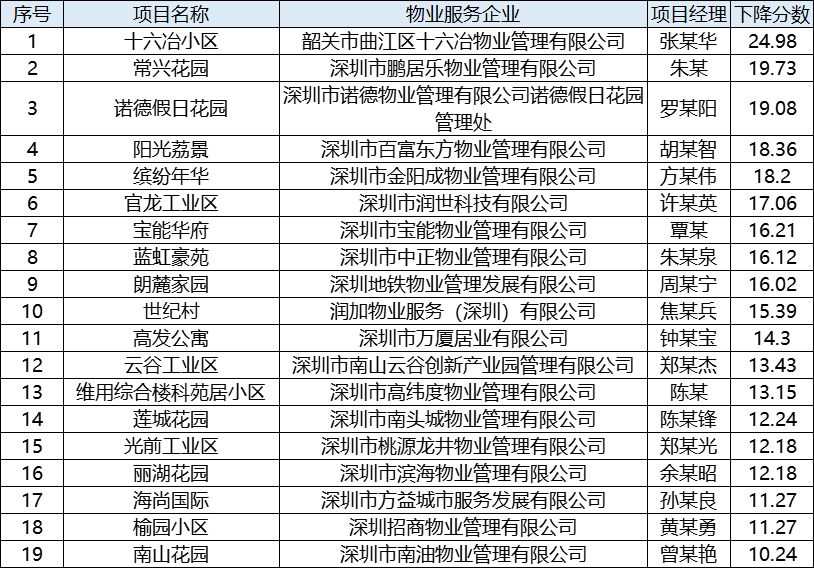 以下19个物业项目的在管物业服务企业未能做好环境卫生整治工作,在全市的环卫指数测评中分数下降在10分以上。望在管物业服务企业及时整改,加强在管项目的环境卫生整治,在2023年的环卫指数测评中取得佳绩。