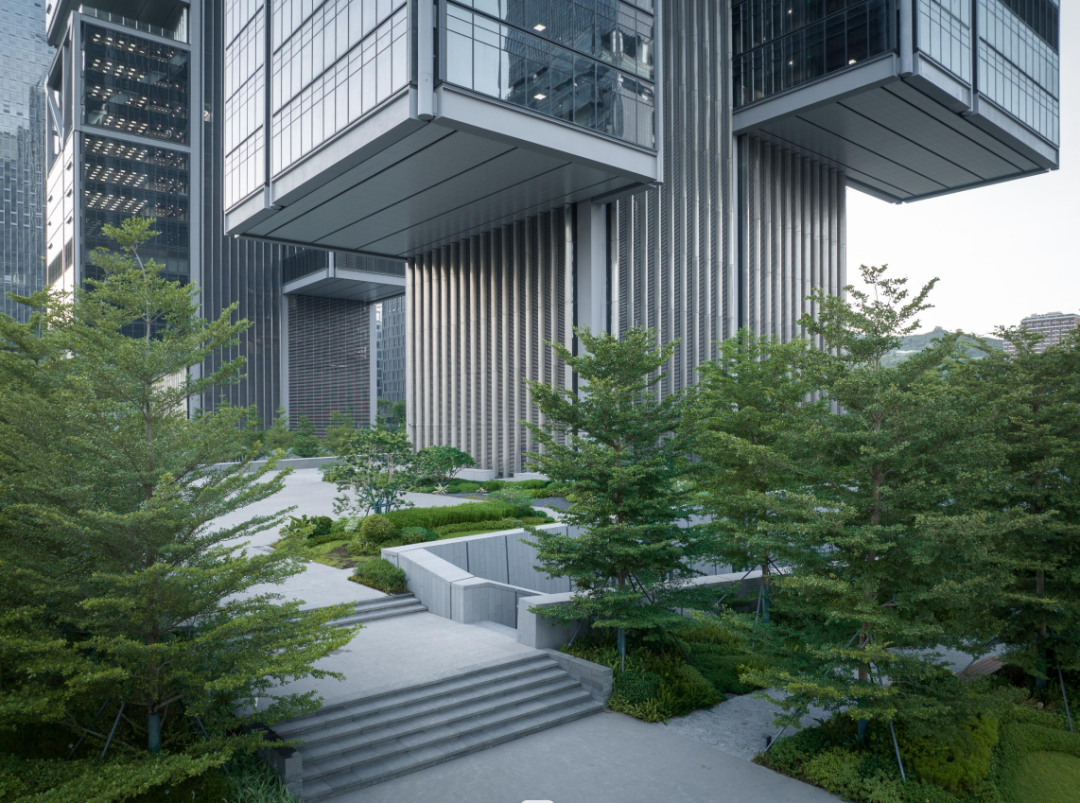 其中,裙楼屋顶花园与周围城市绿化更好地融为一体,为市民和员工提供更多绿色休闲空间。同时,还设有包括社康中心等在内的城市公共设施,为周围市民提供便利。
