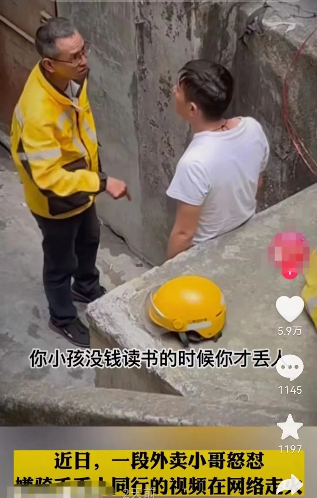 在视频中,新骑手心态失衡觉得“跑外卖丢人”,骑手大哥忍不住“咆哮”:“小孩没钱读书、父母没钱看病、债主上门讨债的时候,你才丢人!”视频下面的评论纷纷为其点赞,“堂堂正正挣钱有什么丢人的?”“话糙理不糙”“只有真心为你着想的人,才会这样骂醒你”……
