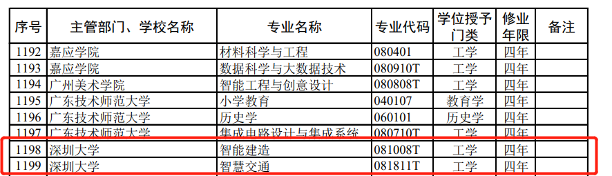 在新增备案本科专业名单内,深圳大学新增智能建造、智慧交通两个专业,学位授予门类为工学,修业年限四年。