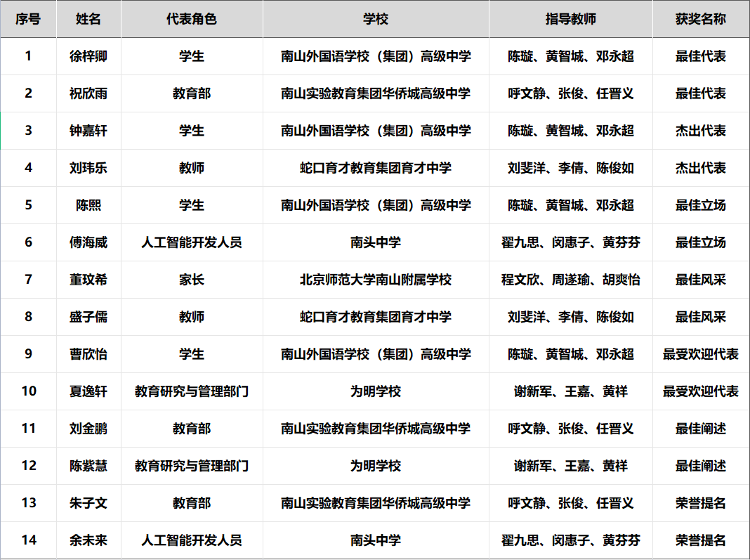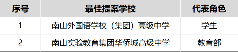 福田区中学英语教研员解玉娟、华侨城高级中学教科室主任李文龙以及育才中学教师黄真担任本次峰会的评委。赛后,评委们通过观察选手的现场表现力和撰写的提案文件,经过综合考量后评选出团体奖项和个人奖项。其中,代表学生角色的南山外国语学校(集团)高级中学和代表教育部角色的南山实验教育集团华侨城高级中学获得团队最高奖项——“最佳提案”奖。