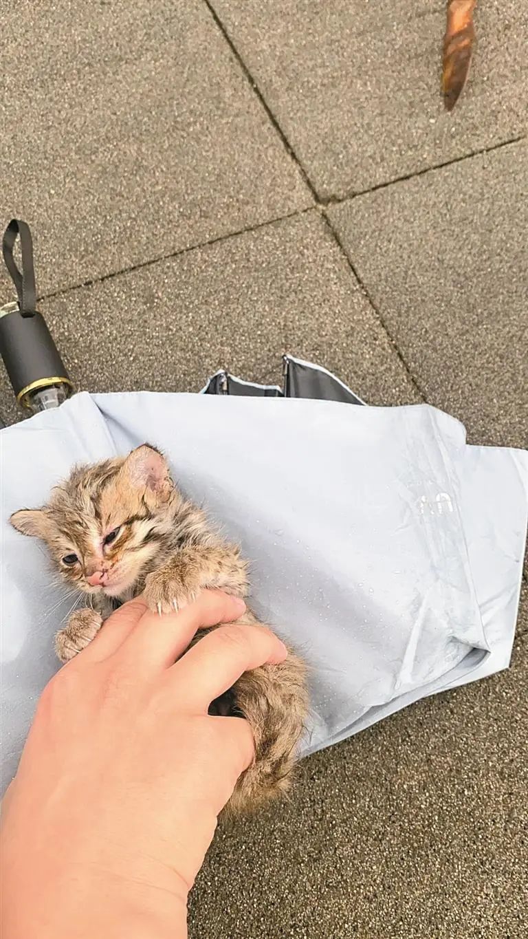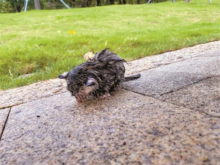 5月7日雨后,市民黎先生路过南山大沙河公园时,偶遇了一只黑色小动物,它蜷缩成一团,远远看去有些像小老鼠,但动作又不像是。走近后黎先生才发现,这是一只黑色斑纹、全身淋湿的“小猫”,趴在路边一动不动,像是冻僵了。