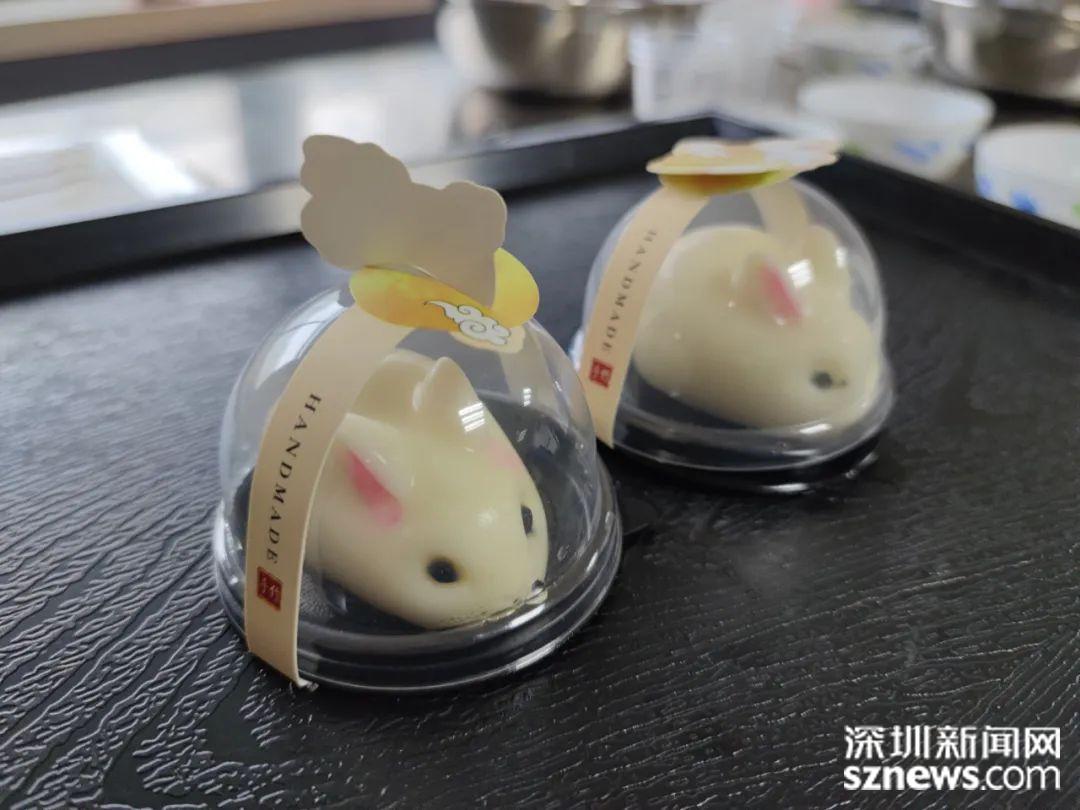 成型后,一只只软软弹弹的小白兔就出现大家面前了,小朋友们用烘焙笔描上兔子的黑色眼睛和粉红色小耳朵,将小兔子装进精巧的小礼盒中,绑上立体围边,制作成一份可爱的礼物,送给自己的妈妈。