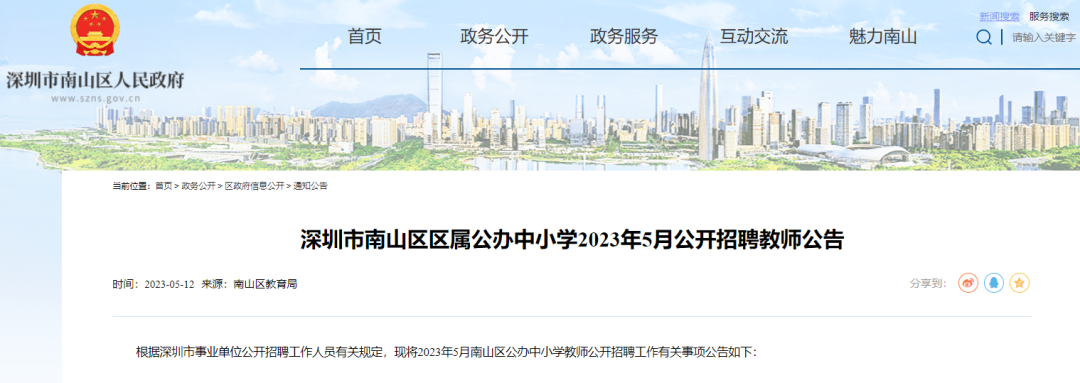 深圳市南山区区属公办中小学2023年5月公开招聘教师公告发布