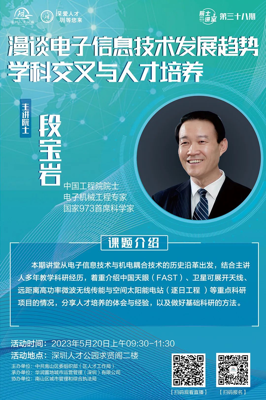 本场讲堂将介绍电子信息技术与机电耦合技术的发展,结合主讲人常年的教学科研经历,着重阐述了中国天眼(FAST)、卫星可展开天线、远距离高功率微波无线传能与空间太阳能电站(逐日工程)等重点科研项目的情况。以此为基础,分享一些人才培养的体会与经验以及做好基础科研的方法。