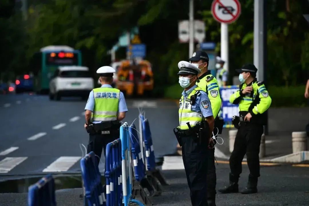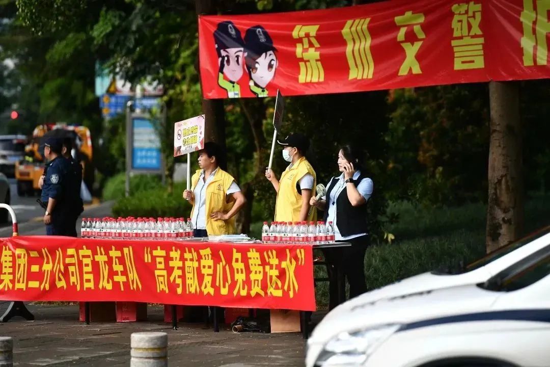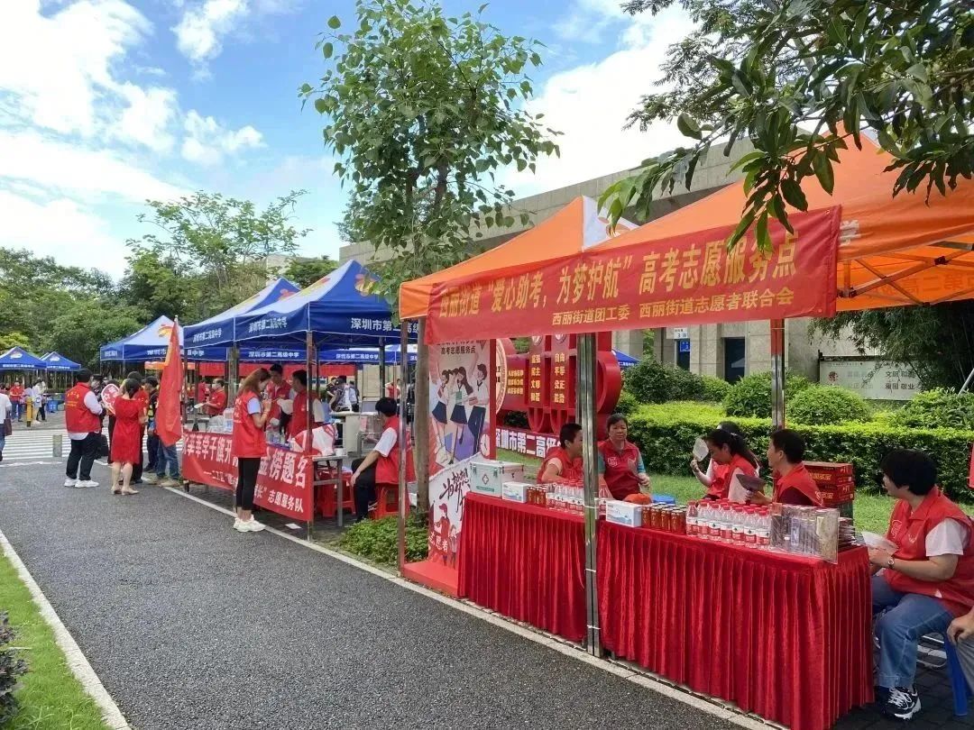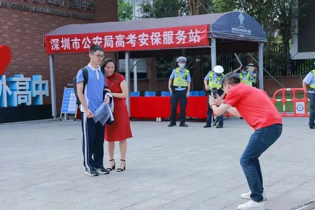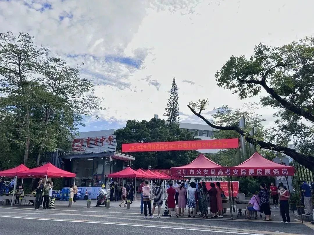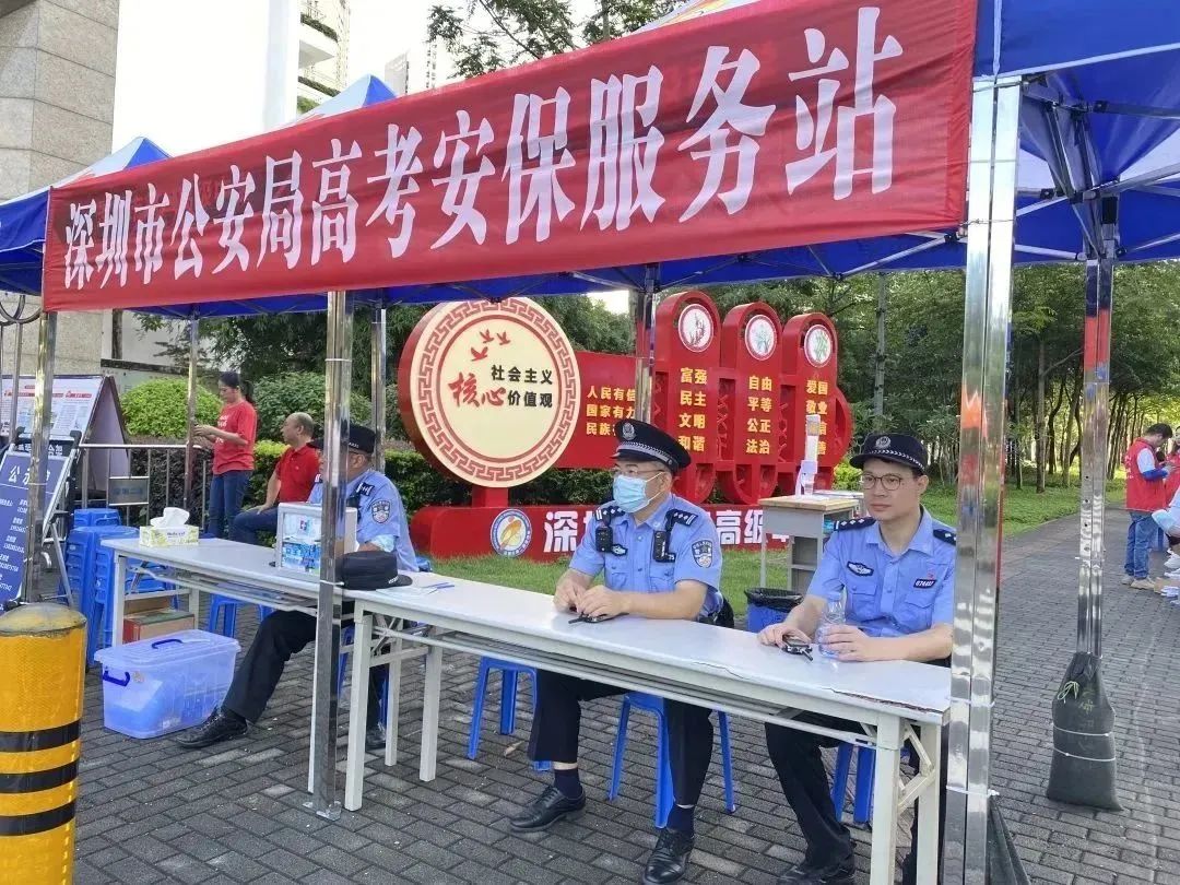考点门口,深圳市公安局设立了高考安保服务站,深圳交警设立了护考服务点,现场还设置有高考服务点,免费向考生及家长提供矿泉水、雨伞、纸巾、文具等物资,以暖心服务为高考护航。