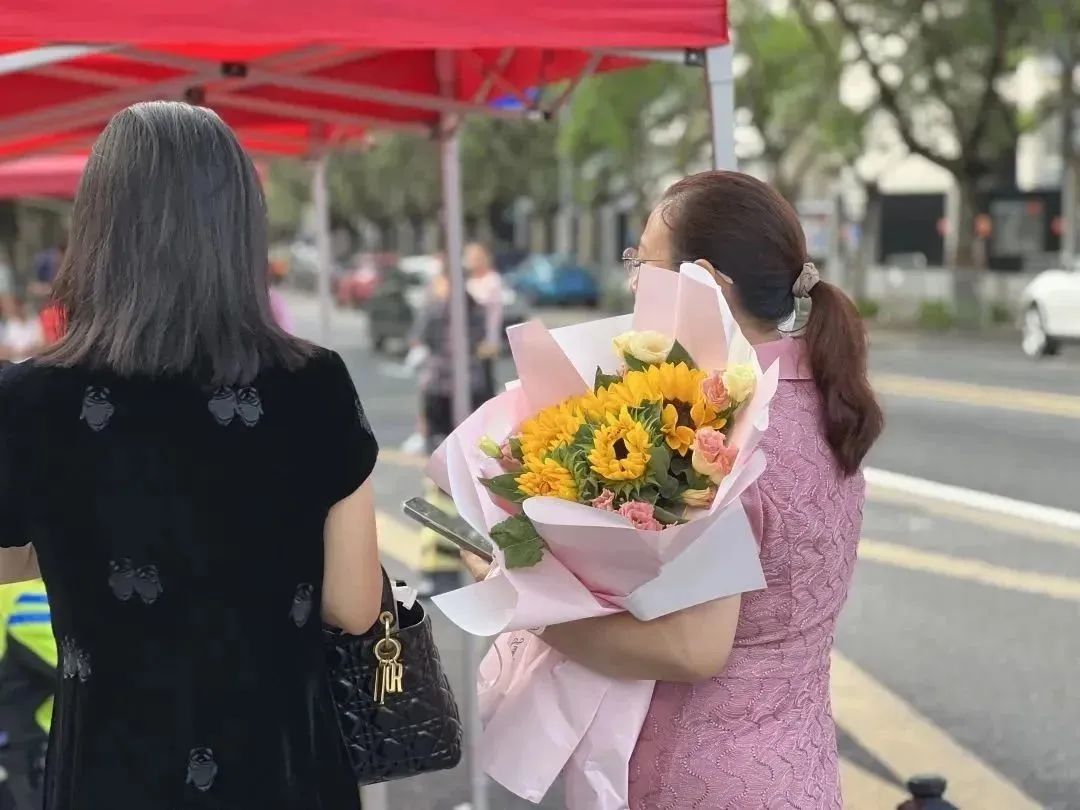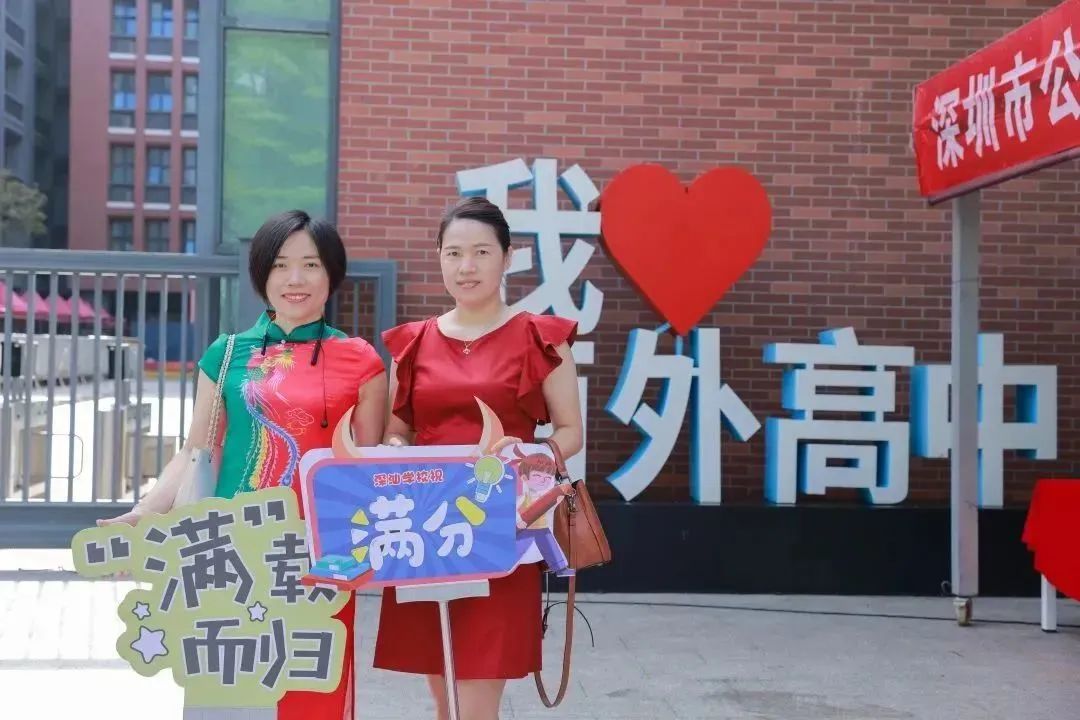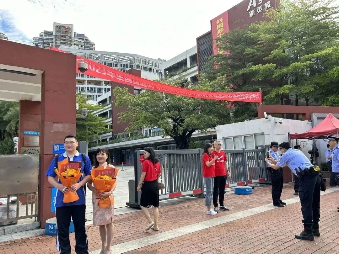 ”在深圳实验学校高中部考点,穿着红旗袍、红T恤,捧着鲜花的家长们,早早来到考场外,和孩子一起迎接人生这场“大考”。