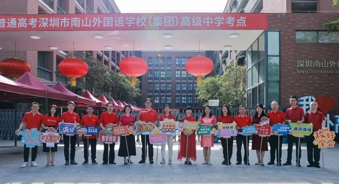此外,来自南山外国语学校(集团)的校长和老师们分成两列,手持“考神附体、战无不胜”“胸有凌云志、爱拼才会赢”“加油吧,少年”“旗开得胜”等应援牌在安检处为孩子们加油,或与走进校门的学生击掌鼓劲,或说着“加油吧,孩子”等祝福语,笑着送考生走进考场。