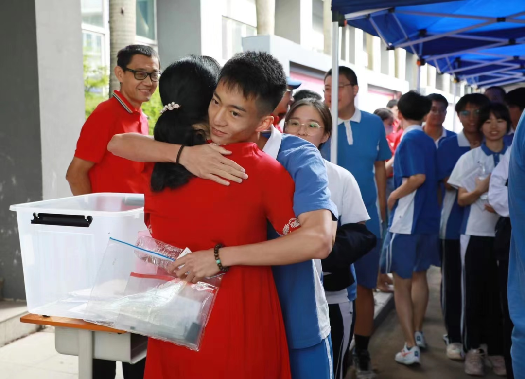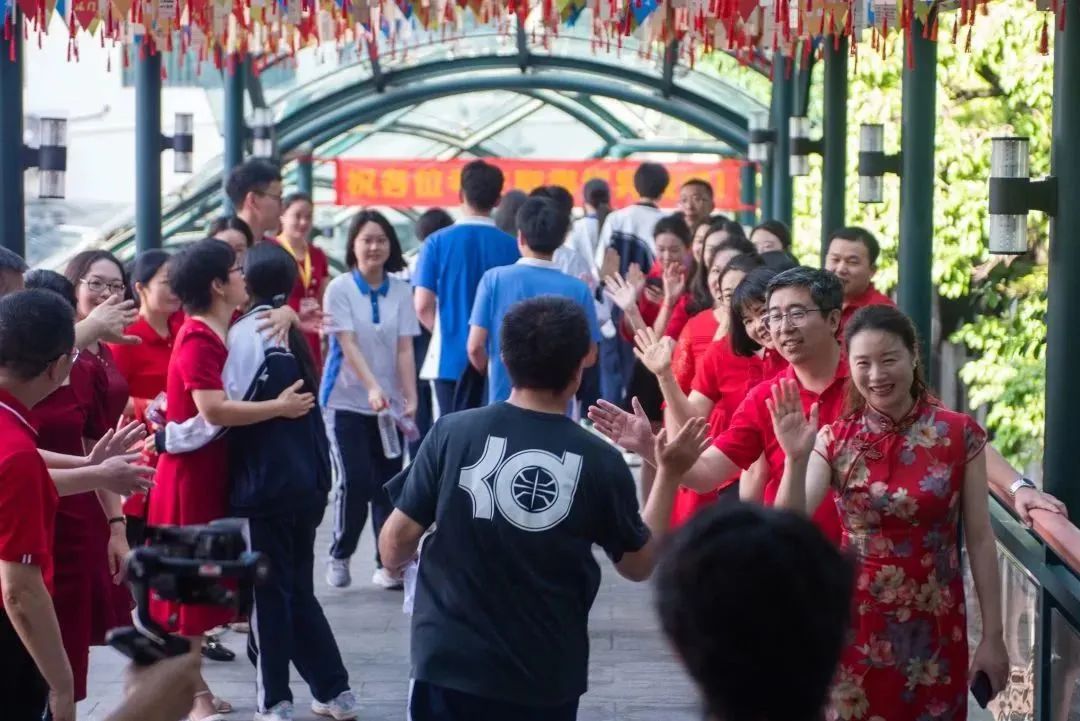 育才中学学校领导、高三语文老师和班主任送考,在图书馆和敏行书院廊桥上与学生击掌,为学生们加油鼓劲。