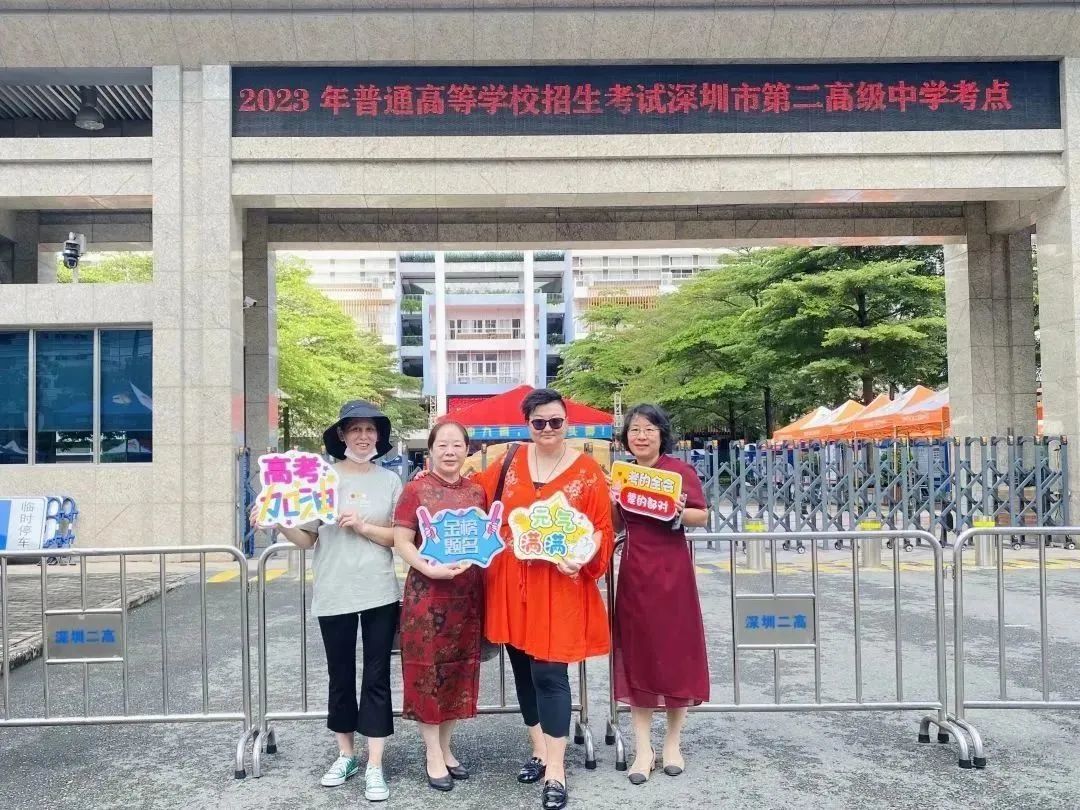 上午8时,记者在深圳市第二高级中学考点门口看到,许多家长身穿靓丽旗袍,手拿助考应援牌,热情洋溢为考生加油鼓劲,祝福他们首场考试旗开得胜。