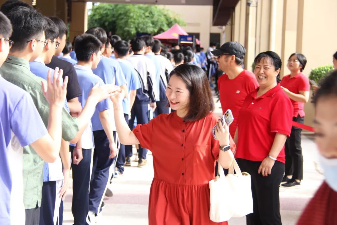 ▲育才中学考点,校领导、高三语文老师和班主任为学生们加油鼓劲。育才中学供图