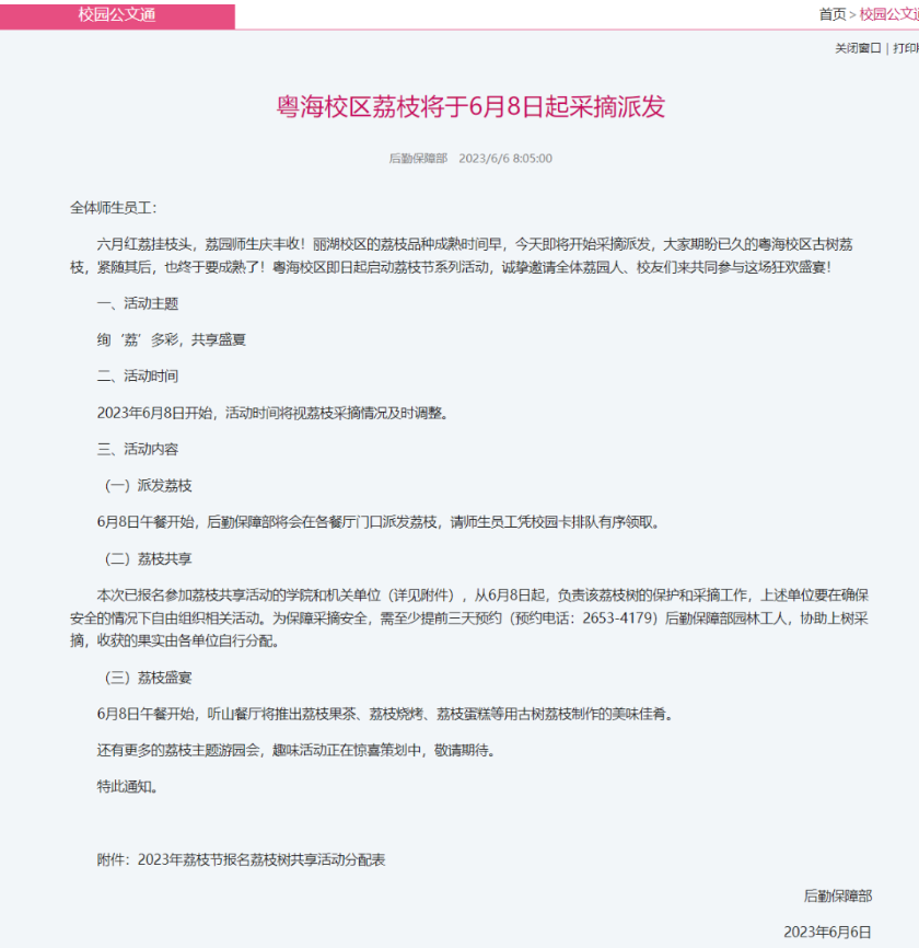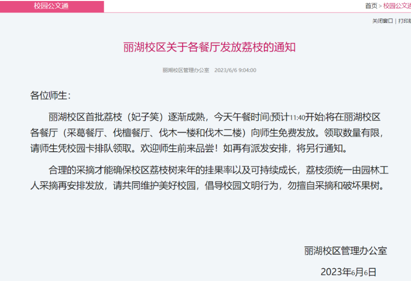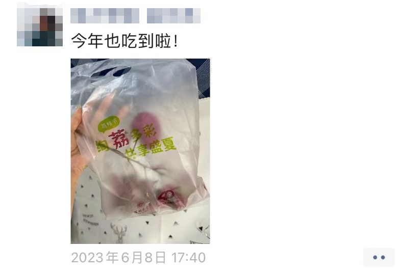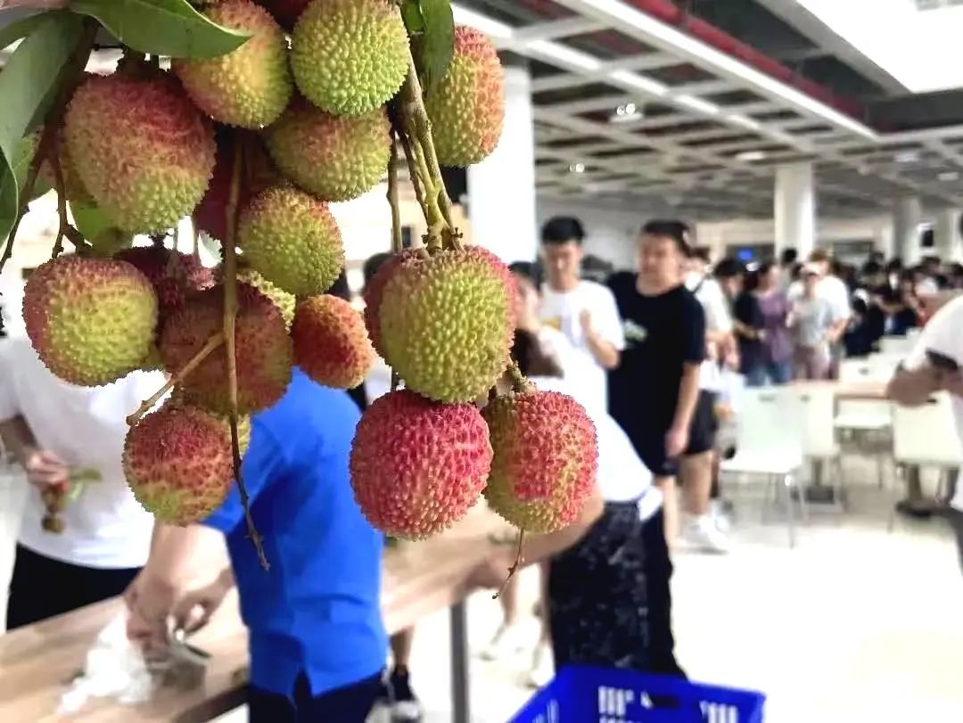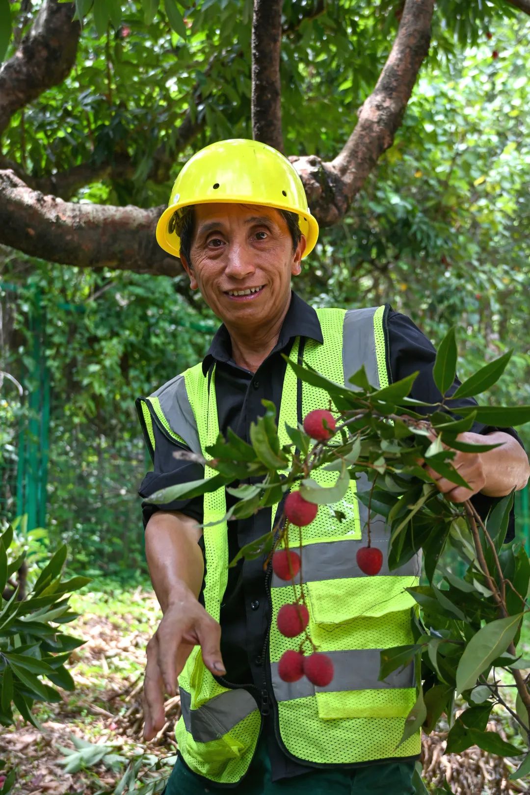 丽湖校区荔枝品种有妃子笑、桂味、糯米糍、荔枝王、黑叶、白蜡、怀枝,共7个品种,其中桂味和糯米糍荔枝树占72.2%。根据挂果情况,今年产量预估6万斤。