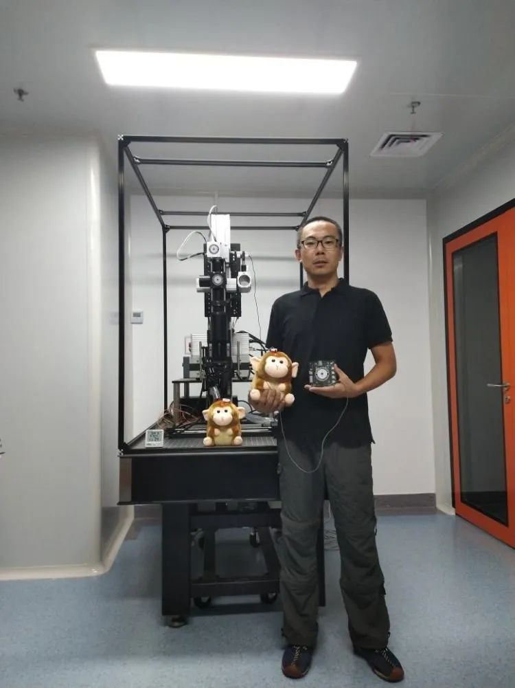 ▲李骁健在自主研发的高性能双光子脑神经成像显微镜旁