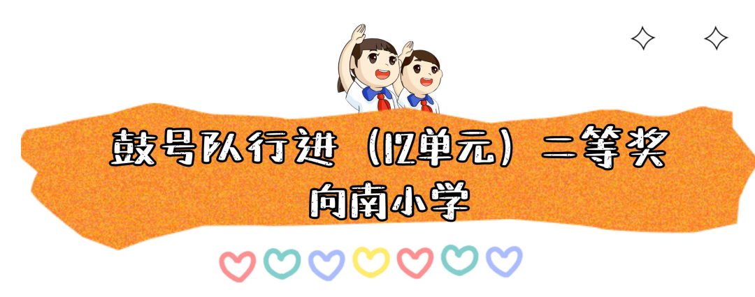 向南小学鼓号队共12单元,他们的口号是:鼓号响云飞扬,少年强梦翱翔!