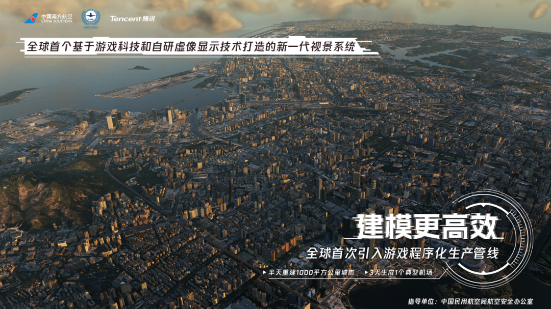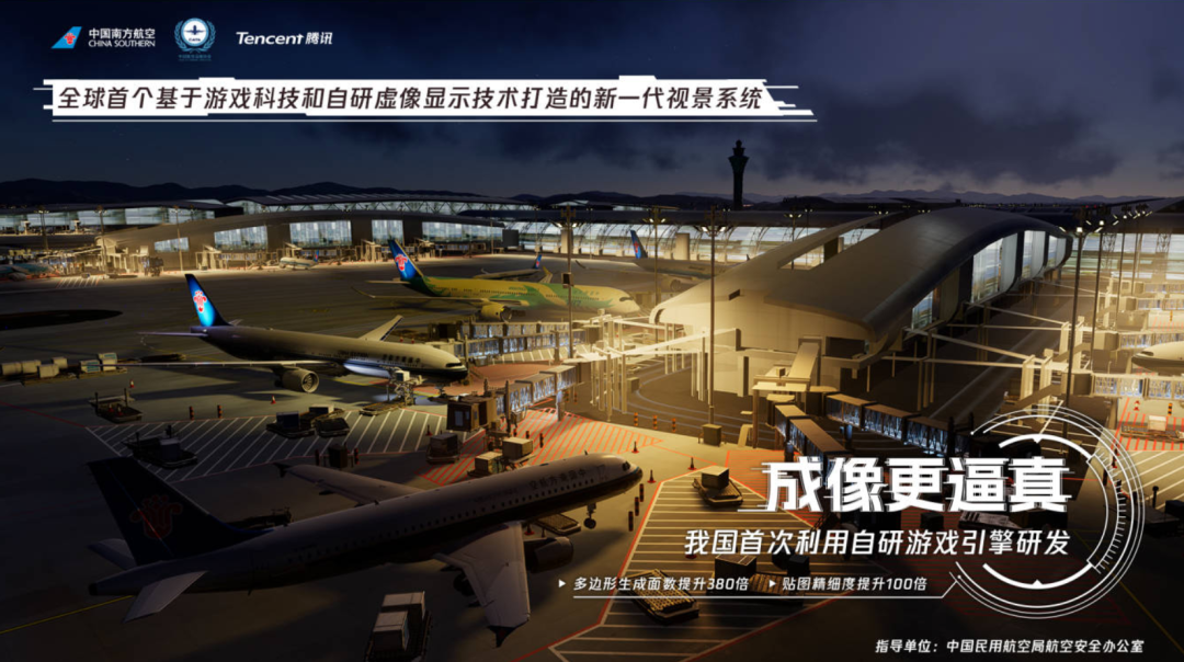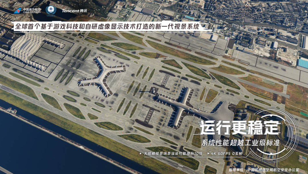 作为全球首个基于游戏科技和虚像显示技术打造的全新一代视景系统,它以腾讯自研游戏引擎和南航自研虚像显示技术为基础,可以更快速地创造出超拟真、大规模、高沉浸的训练场景,为飞行员提供1:1的真飞机模拟仿真驾驶体验和第一视角的世界场景图像渲染,助力飞行训练更高效、更安全。