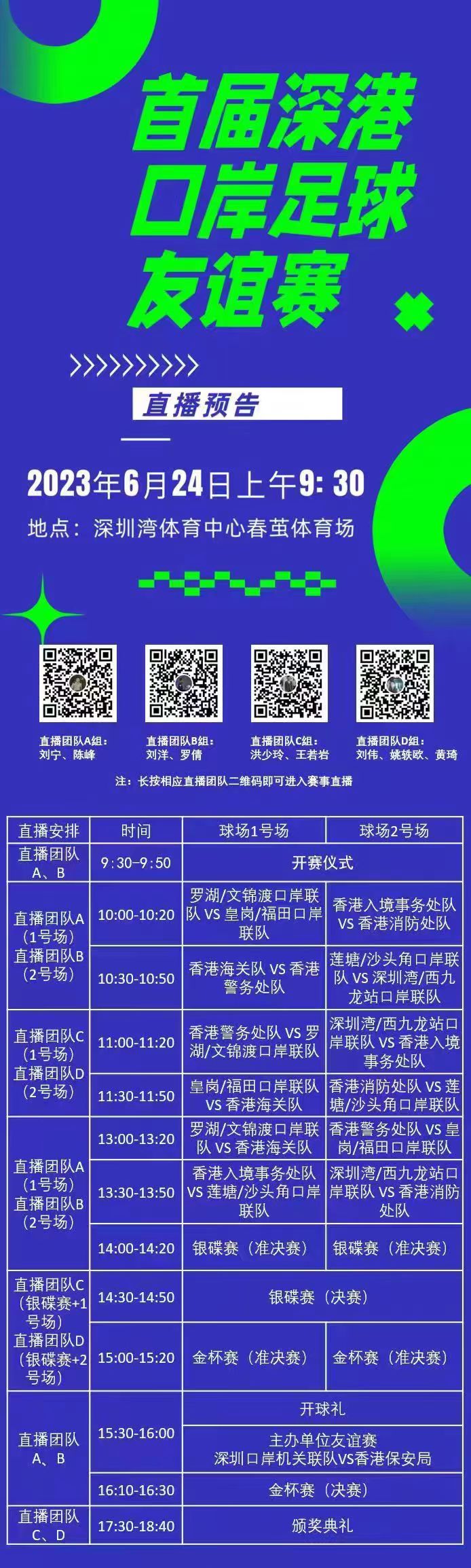 据悉,首届赛事由深圳市人民政府口岸办公室、香港特别行政区政府保安局合作举办,深圳市人民政府港澳事务办公室、深圳市文化广电旅游体育局协办,深港口岸部门将分别组织4支球队参赛。比赛采用7人赛制,8支参赛球队分两个小组进行单循环比赛,每个小组前两名晋级金杯赛,后两名参加银碟赛,分别以交叉淘汰、排位赛方式决出名次。