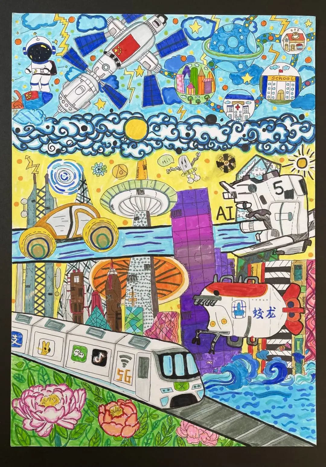 “未来,我们的交通会更加便利,会有各式各样的新型交通工具诞生,城市和城市之间也会建成专供交通工具通行的管道,这样我们就可以快速到达任何你想去的地方了。”来自深圳市南山区第二外国语学校(集团)海岸小学的黄诗蕾在绘画作品《新时代》里描绘了她对未来的无限畅想。