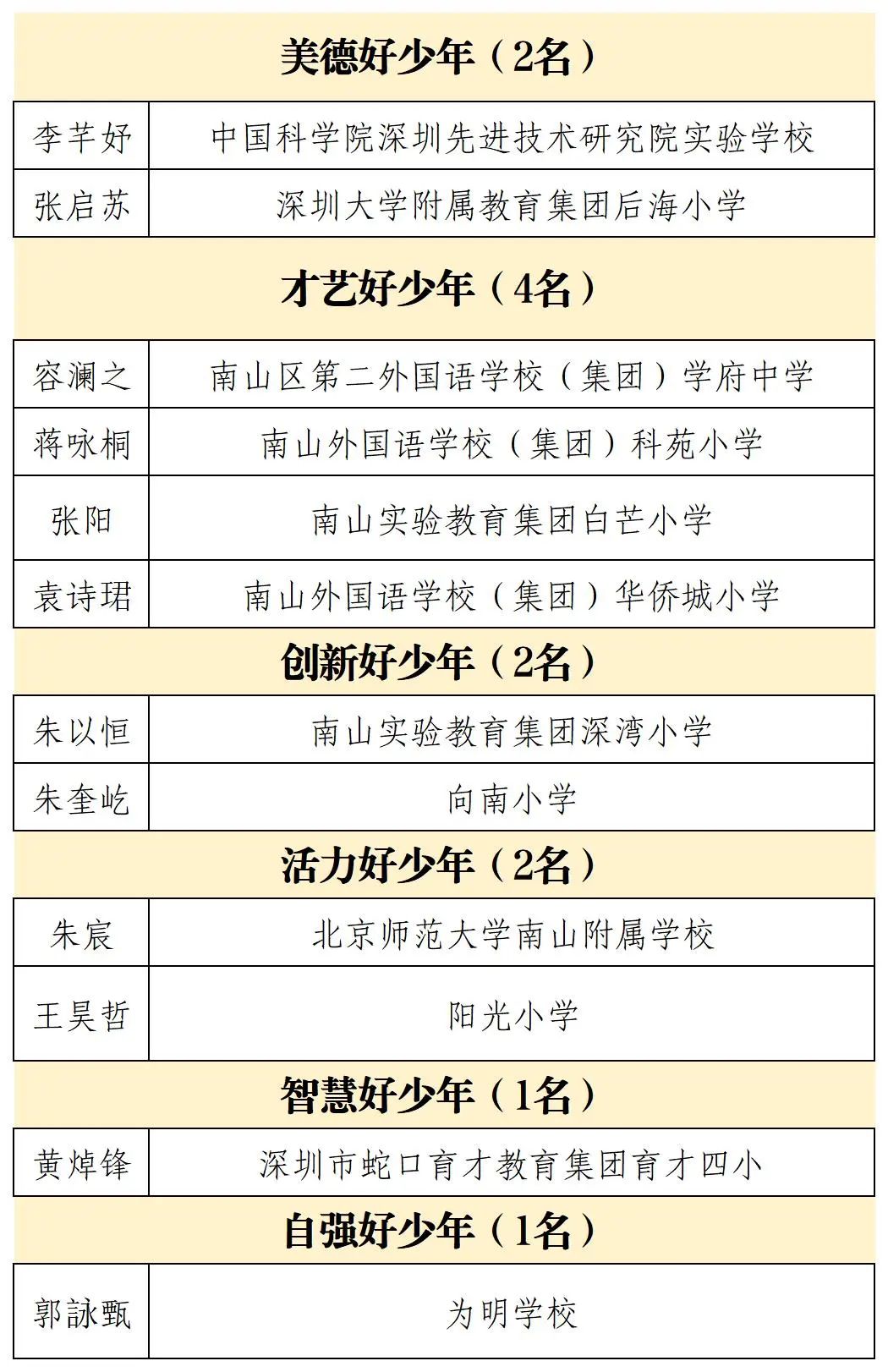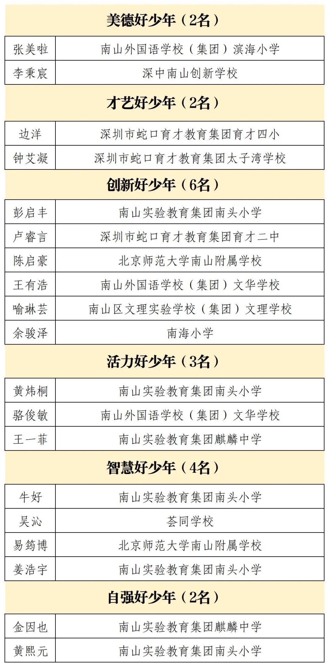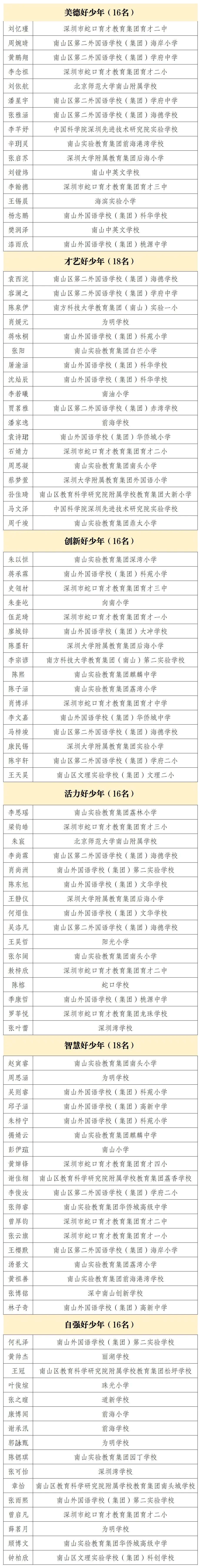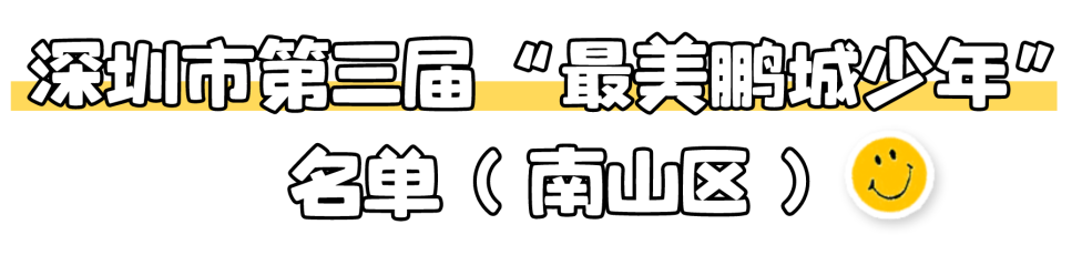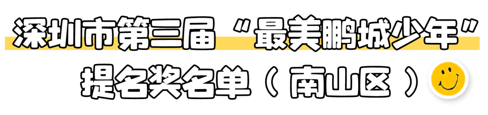 经过学校推报,区级、市级、省级层层选拔,南山青少年2人获评广东省“最美南粤少年”,1人获评广东省“最美南粤少年”提名奖,19人获评深圳市“最美鹏城少年”,12人获评深圳市“最美鹏城少年”提名奖,100人获评南山区“最美南粤少年”,一起来认识他们吧!