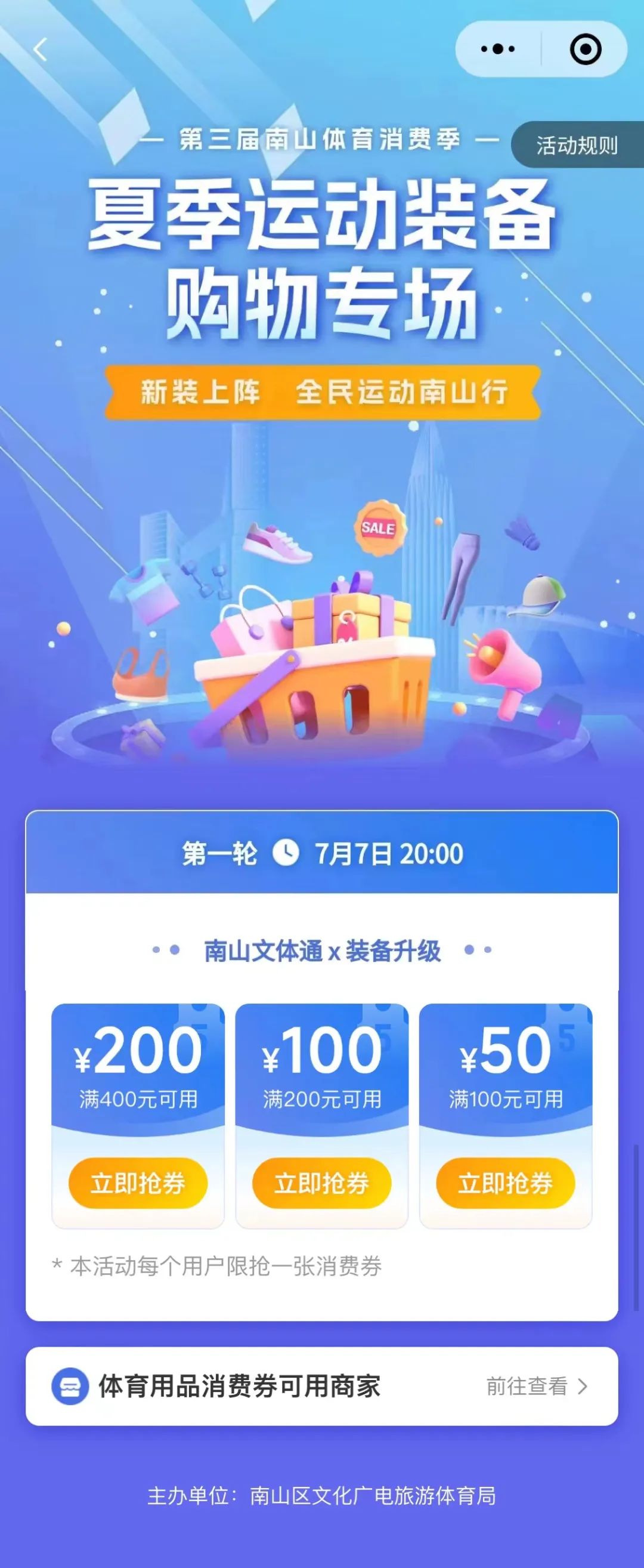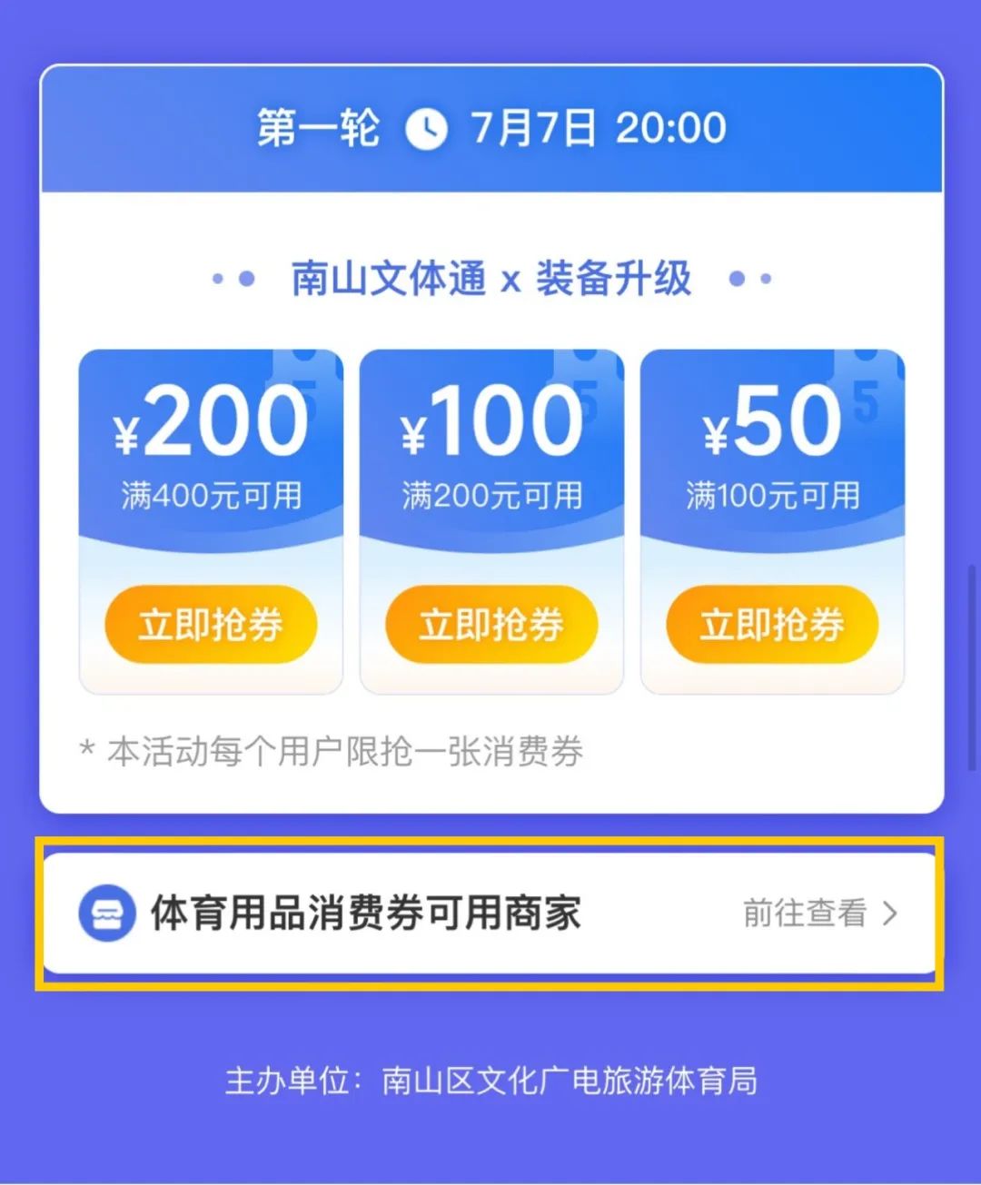 第三届南山体育消费季(夏季装备升级专场)仅限位于深圳地区和香港地区的市民用户通过线上微信登录“南山文体通”小程序实名参与。为快速完成抢券,可提前按要求进行授权手机号和账号实名,获得抢券资格, 待抢券时间开始后即可直接抢券。