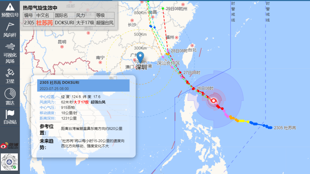 7月25日早晨08时,超强台风“杜苏芮”位于距离深圳1231公里的海面上,预计将以每小时15-20公里的速度向西北方向移动,强度还将进一步加强。