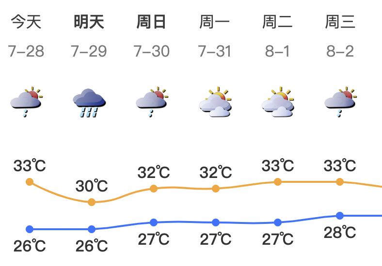 28-29日有大雨到暴雨,最大阵风中西部5-7级,东部沿海和海区7-8级,深汕8-9级,28日气温26-33℃;