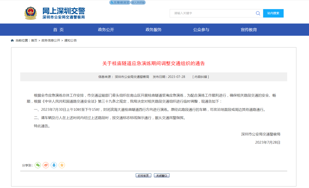 一、2023年7月30日上午10时至下午15时,封闭滨海大道桂庙隧道西行方向进行演练。原经此路段通行的车辆,可改沿地面段或周边其他道路通行。