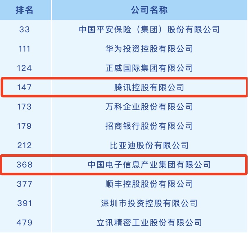 具体来看,腾讯控股有限公司营收为82439.6百万美元。中国电子信息产业集团有限公司营收为40326.3百万美元。