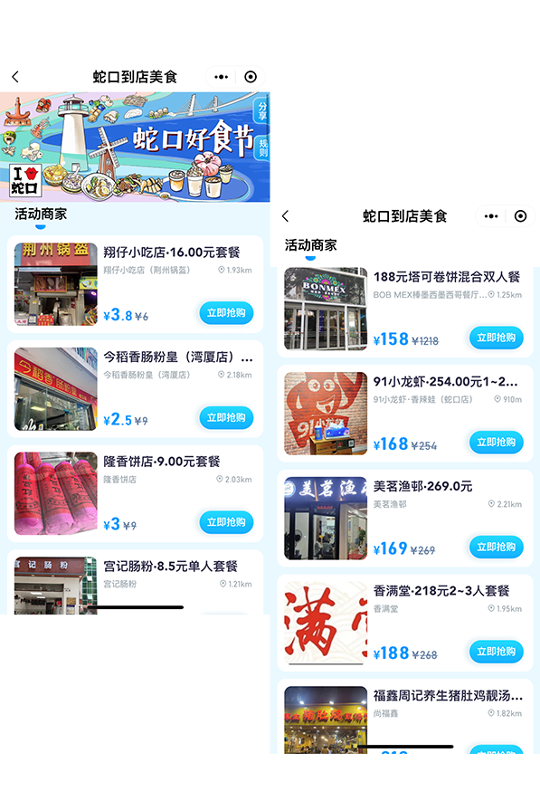 参与本次“蛇口好食节”的商户多达50家, 从老字号到人气新店应有尽有。截至8月18日,市民可在微信小程序【乐商圈】“蛇口好食节”活动专题页一键领取专属【优惠券】。快叫上你的“饭搭子”,一次性吃个够~