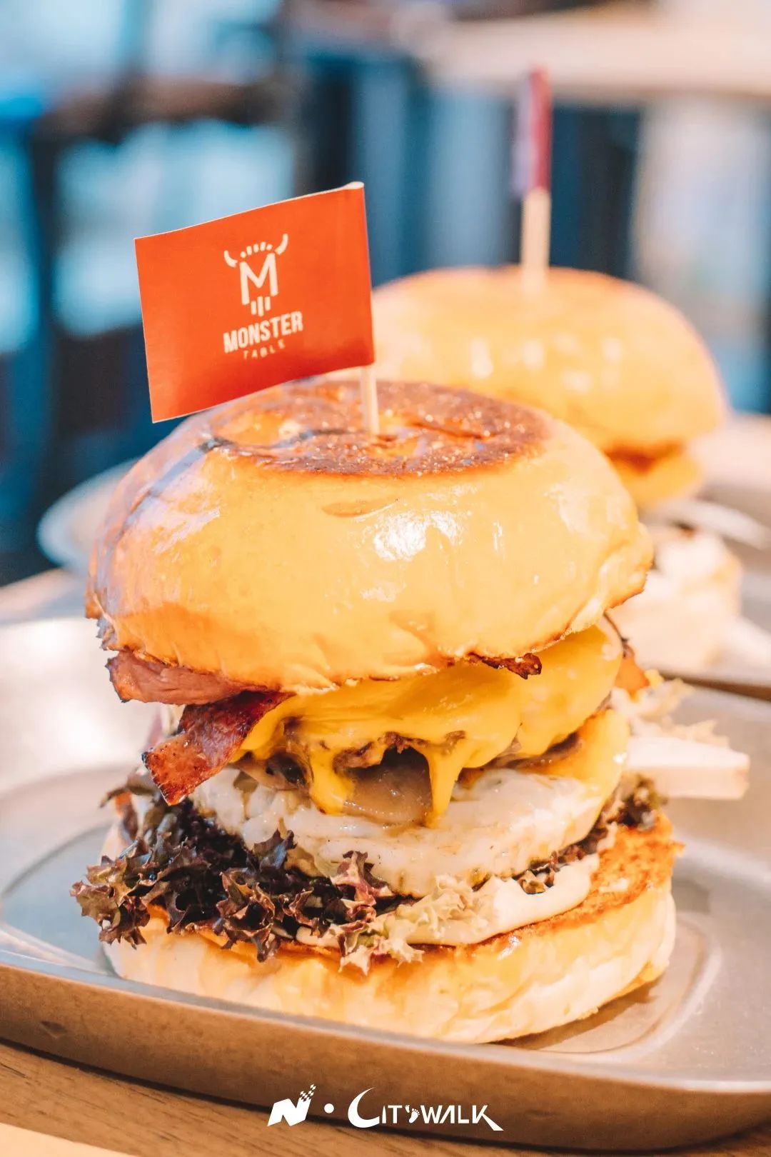 款式多、分量大、材料好,汉堡一定要会流汁,面包一定两面煎烤,最后插上怪兽旗帜,一整个仪式感拉满。