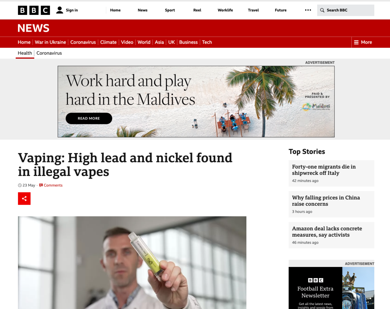 图:BBC报道《在非法电子烟中发现超标的铅和镍》
